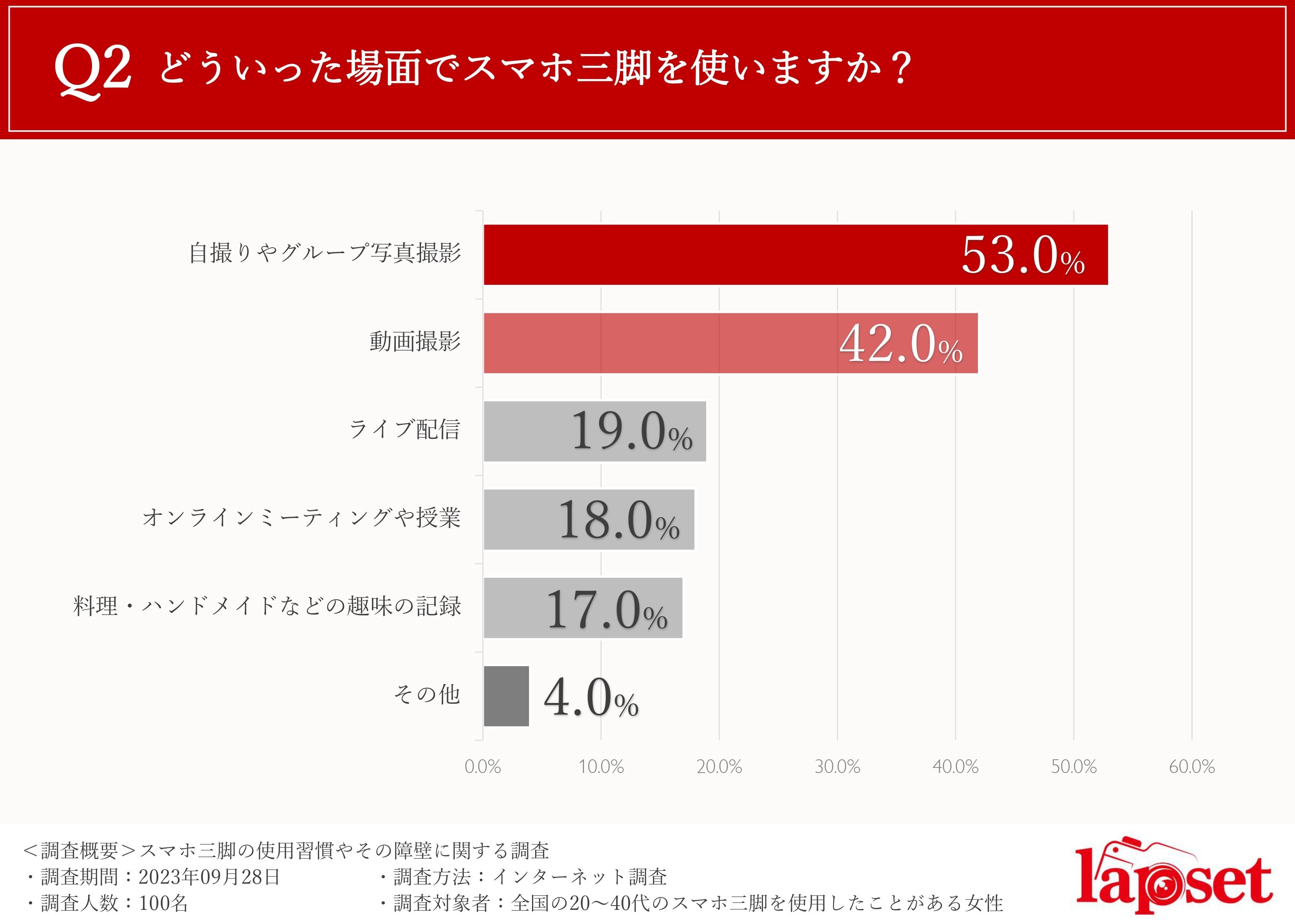 使用する場面を伺ったところ「自撮りやグループ写真撮影(53%)」「動画撮影(42%)」という結果となりました。
