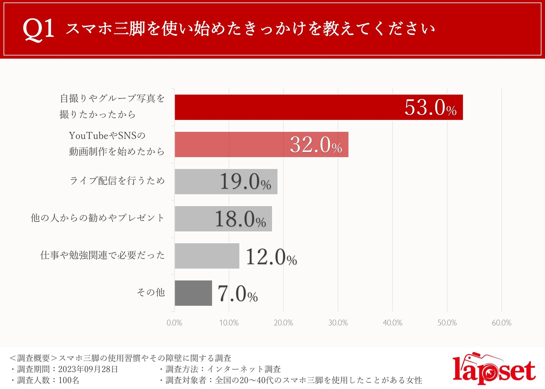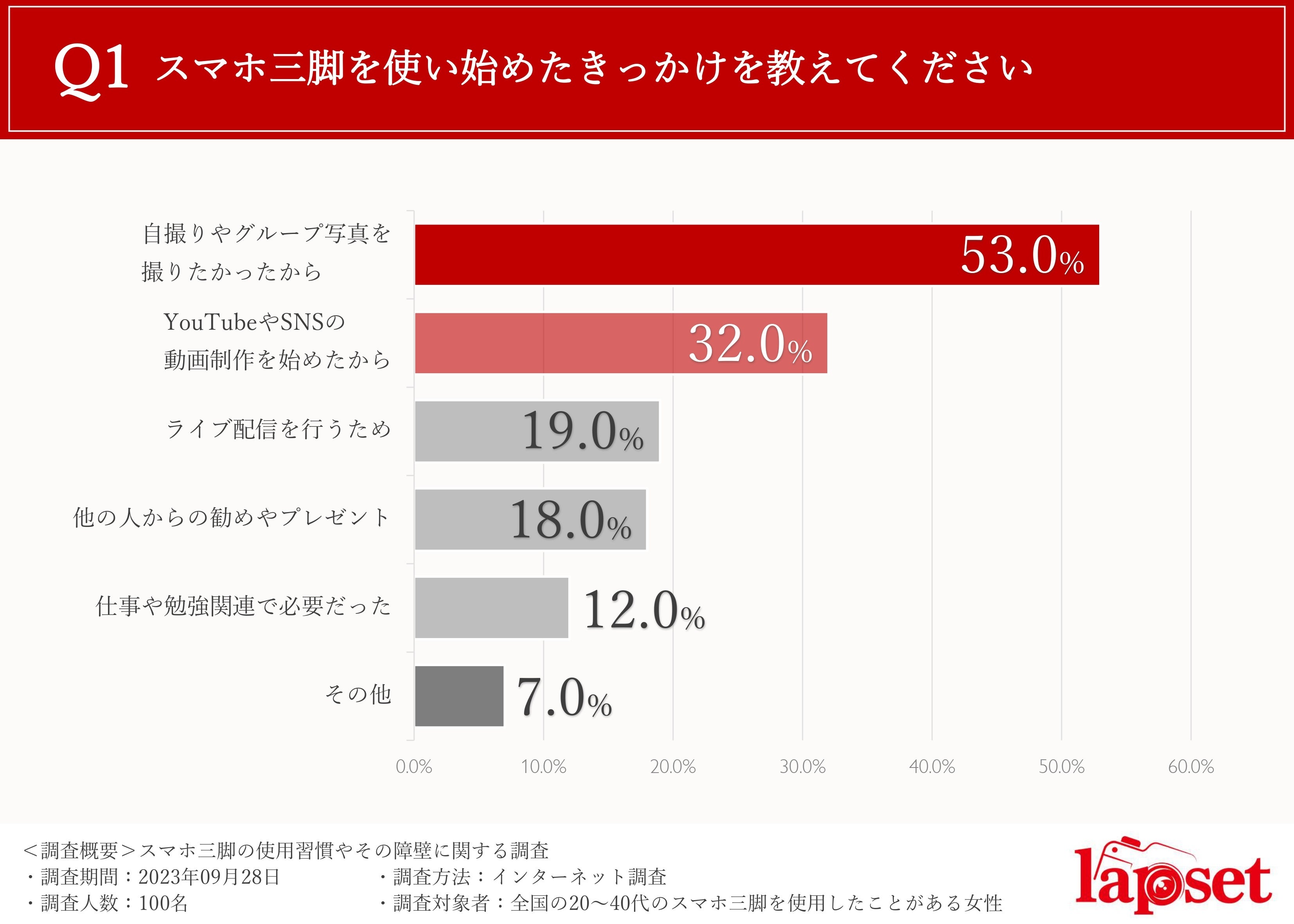 はじめに、スマホ三脚を使い始めたきっかけについて伺ったところ、「自撮りやグループ写真を撮りたかったから(53%)」という回答が最も多い結果となりました。