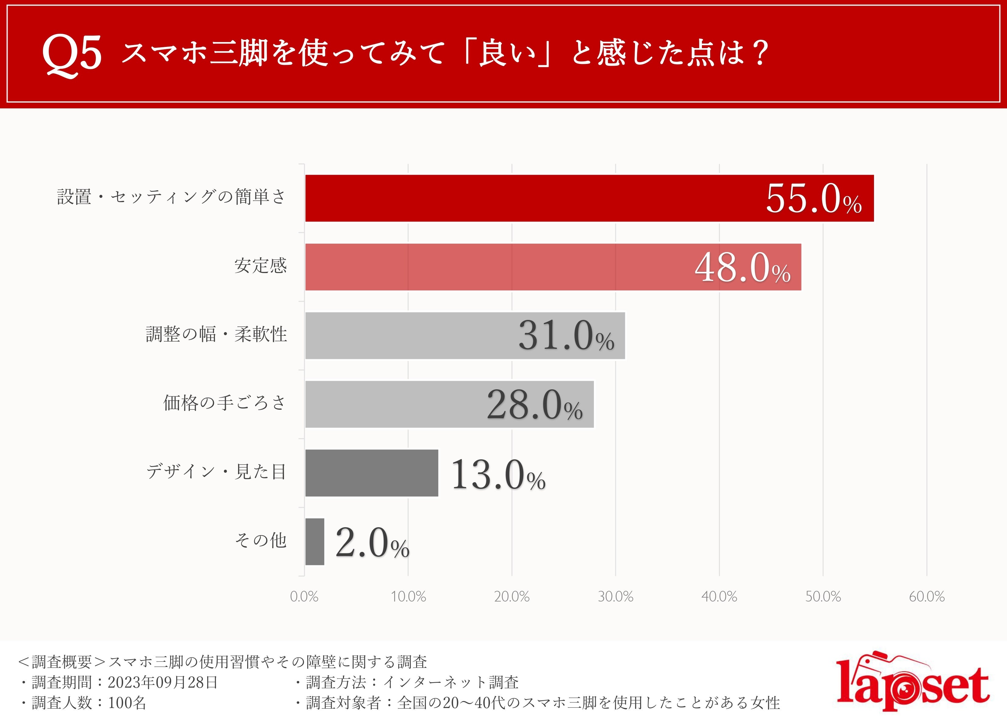 スマホ三脚を使ってみて「良い」と感じた点について調査を行ったところ、「設置・セッティングの簡単さ(55%)」「安定感(48%)」「調整の幅・柔軟性(31%)」という結果となりました。