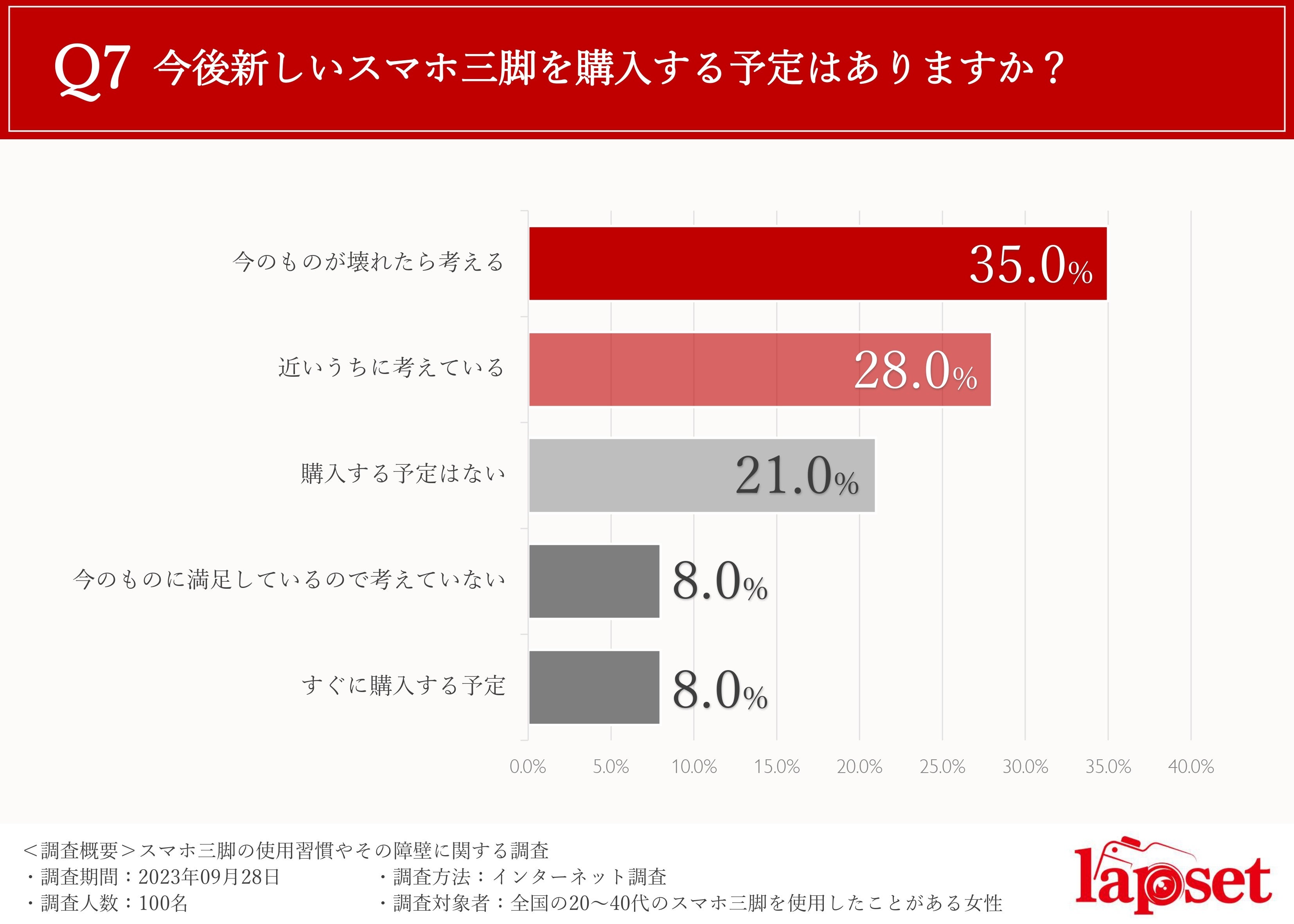 最後に、今後、新しいスマホ三脚を購入する予定があるか伺ったところ、「今のものが壊れたら考える(35%)」「近いうちに考えている(28%)」「購入する予定はない(21%)」という結果となりました。