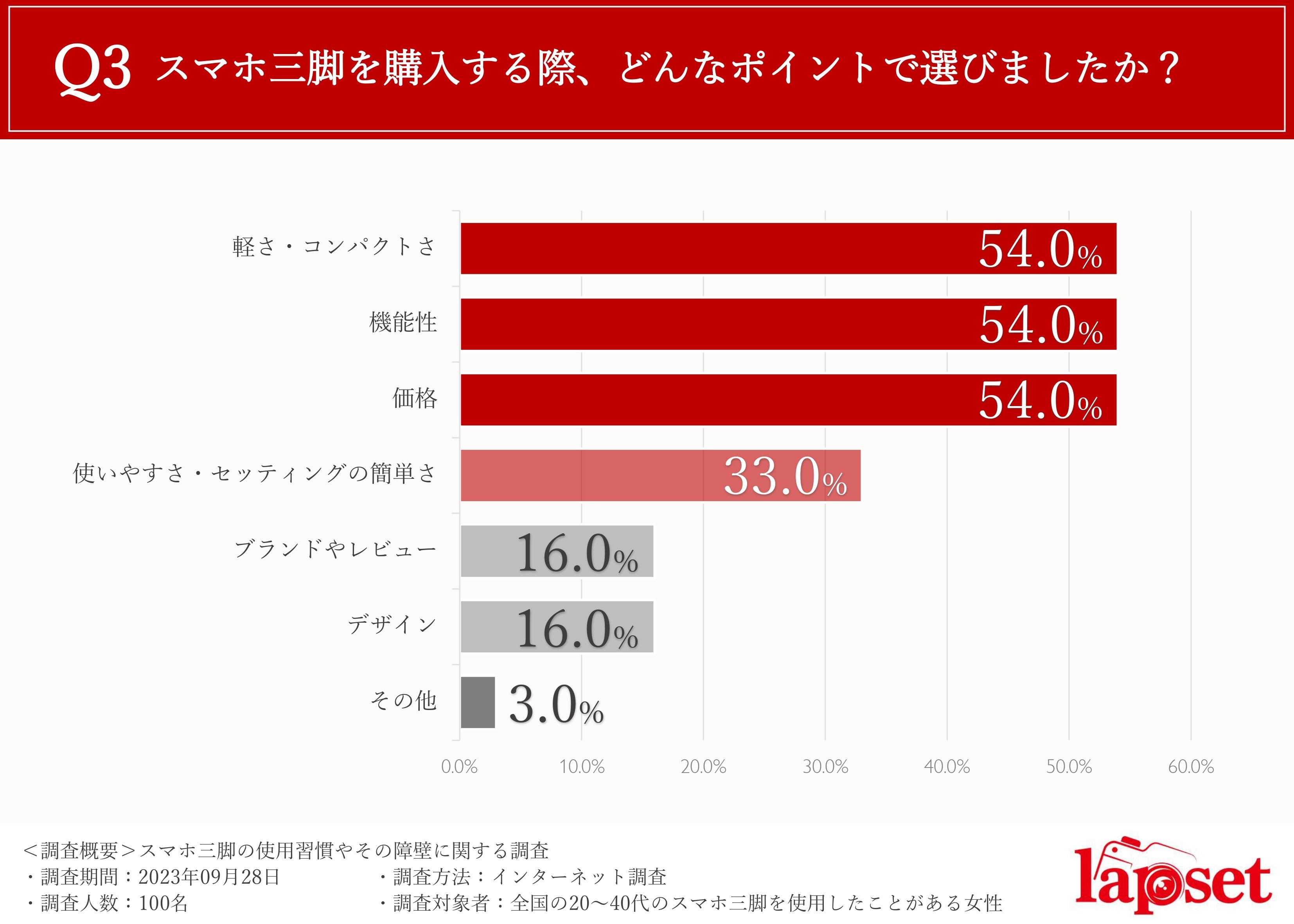 実際に、購入のポイント1位に「軽さ・コンパクトさ」が入っており、今後スマホ三脚を購入する方は参考になる結果になったのではないでしょうか。