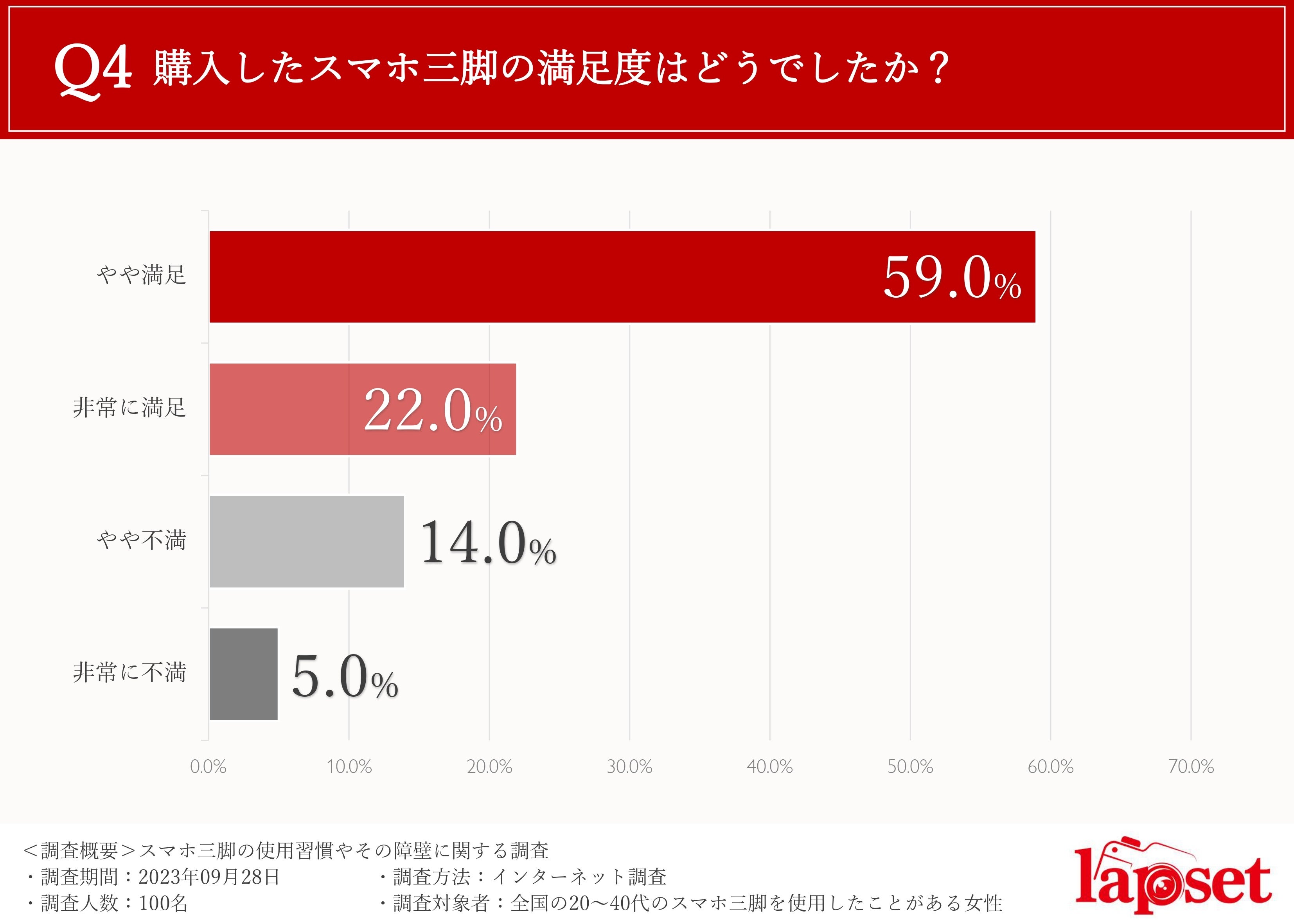スマホ三脚の満足度について伺ったところ、「やや満足(59%)」「非常に満足(22%)」という結果となり、8割以上の方が満足と回答しました。