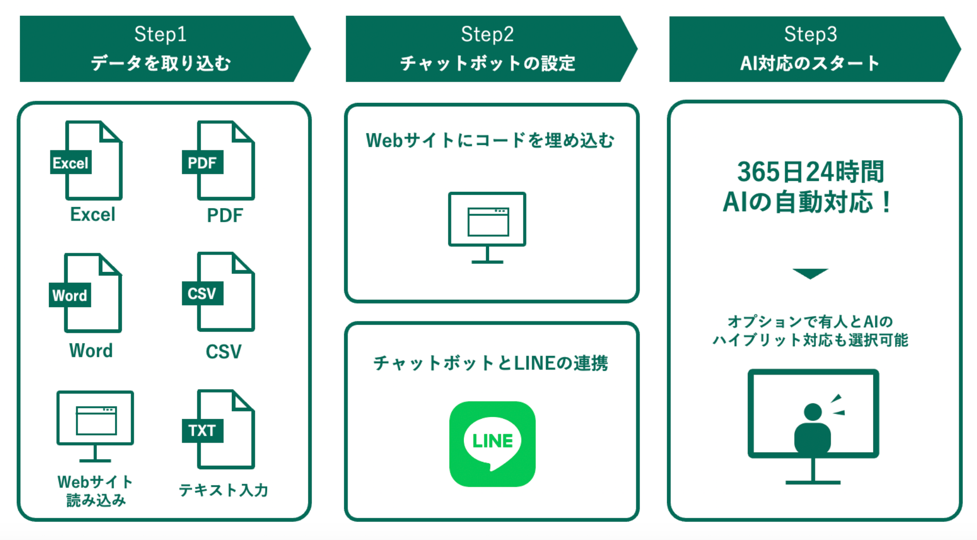 PecoChatの導入は非常に簡単です。申し込み後、必要なデータをアップロードするだけで、数秒でAIが学習を完了します。専門的な技術知識は一切不要です。