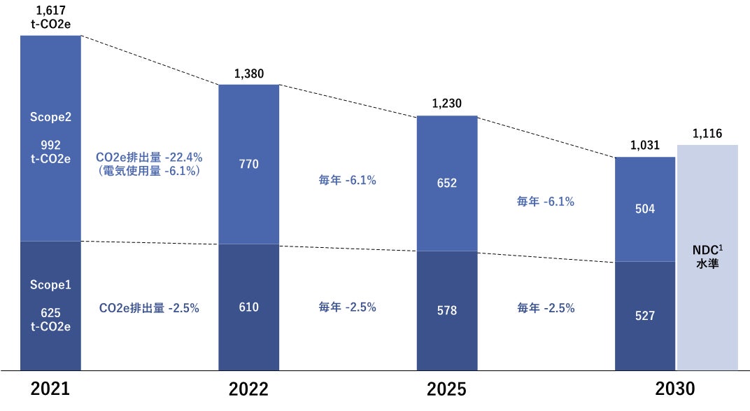 2021年度から11社が一丸となりカーボンニュートラルに取り組み、重油やガソリン等による直接排出(Scope1)を2.5%、電力による間接排出(Scope2)を22.4%、全体で約15%のCO2eを削減しました。照明のLED化や社用車のEV化、電力消費モニタリングシステムの導入等によりエネルギー使用量を削減した成果です。引き続き、重油ボイラーの運用改善等に取組み、2030年度はエネルギー使用量の削減効果のみで、NDC[1]水準(2013年度比46%削減)を達成する計画です。