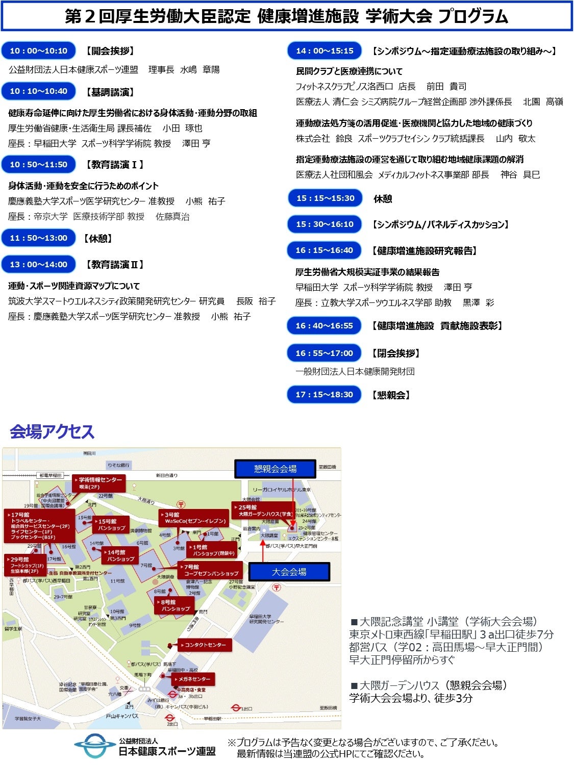 公益財団法人日本健康スポーツ連盟は、3月20日(水・祝)、健康増進施設・指定運動療法施設のさらなる普及を目指し「第2回厚生労働大臣認定 健康増進施設学術大会」を、早稲田大学大隈記念講堂小講堂にて開催いたします。