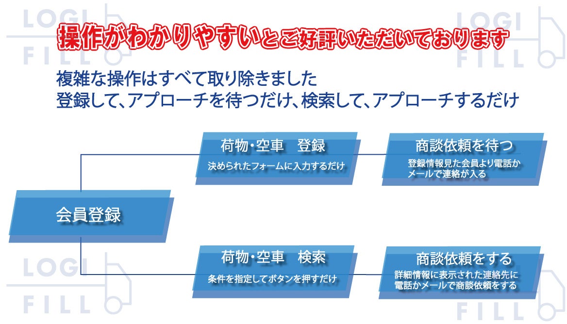 LOGIFILLでは、複雑な操作はすべて取り外し、登録、検索、問合せの三つの操作だけで、ご利用いただくことができます。ご利用料金につきましても、荷主企業と運送会社で検索や登録の利用範囲をわけることなく、1アカウント月額5000円(税別)でどちらもご利用いただけます。