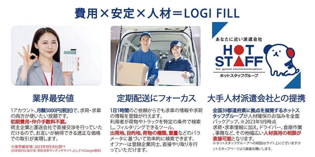 株式会社LOGIFILL(本社:神奈川県茅ヶ崎市、代表:竹上 諒英)は、2023年10月2日に定期トラック便にフォーカスした求荷求車(求貨求車)マッチングサイト「LOGI FILL(ロジフィル)」をリリースしました。