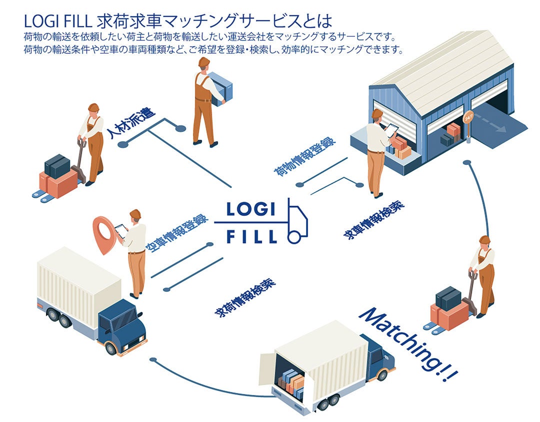 今、目前に迫っている物流業界における2024年問題。ドライバー不足、長時間労働、EC市場の拡大による物流の増加など、さまざまな問題が発生する事が懸念されています。LOGIFILLは、物流業界の課題解決に貢献することを目的に、全国対応の広域ネットワークを活用し、運送会社同士の協業、荷主企業との連携を強める情報プラットホームとして、このたび求荷求車マッチングサイトの提供を開始いたしました。
