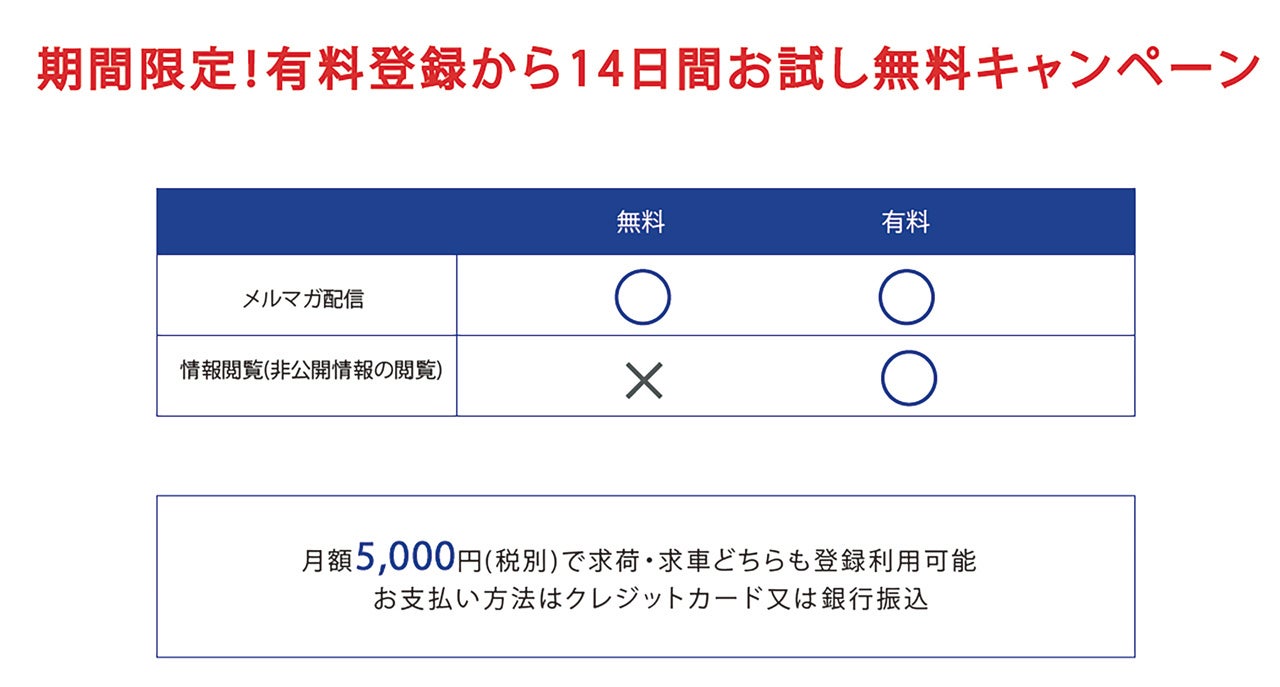 ■1日1時間からの求荷求車(求貨求車)が可能。登録後14日間お試しキャンペーンを実施