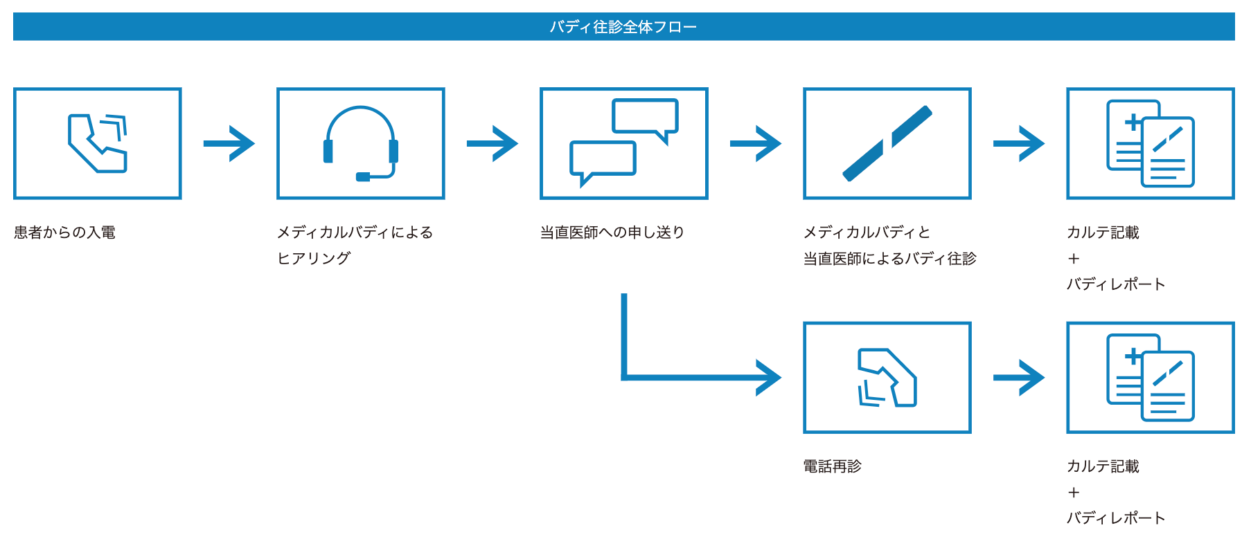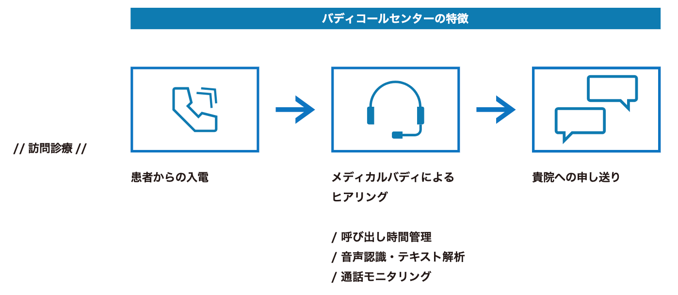 在宅医療を熟知したメディカルバディが電話対応するため、患者対応のファーストタッチに求められる在宅クリニックとしての「温度感」まで再現します。