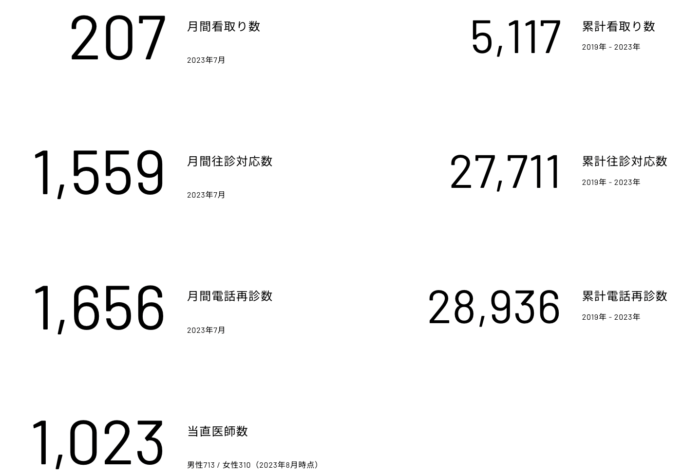登録医師約1000名、往診件数約2.5万件、お看取り5000名の実績