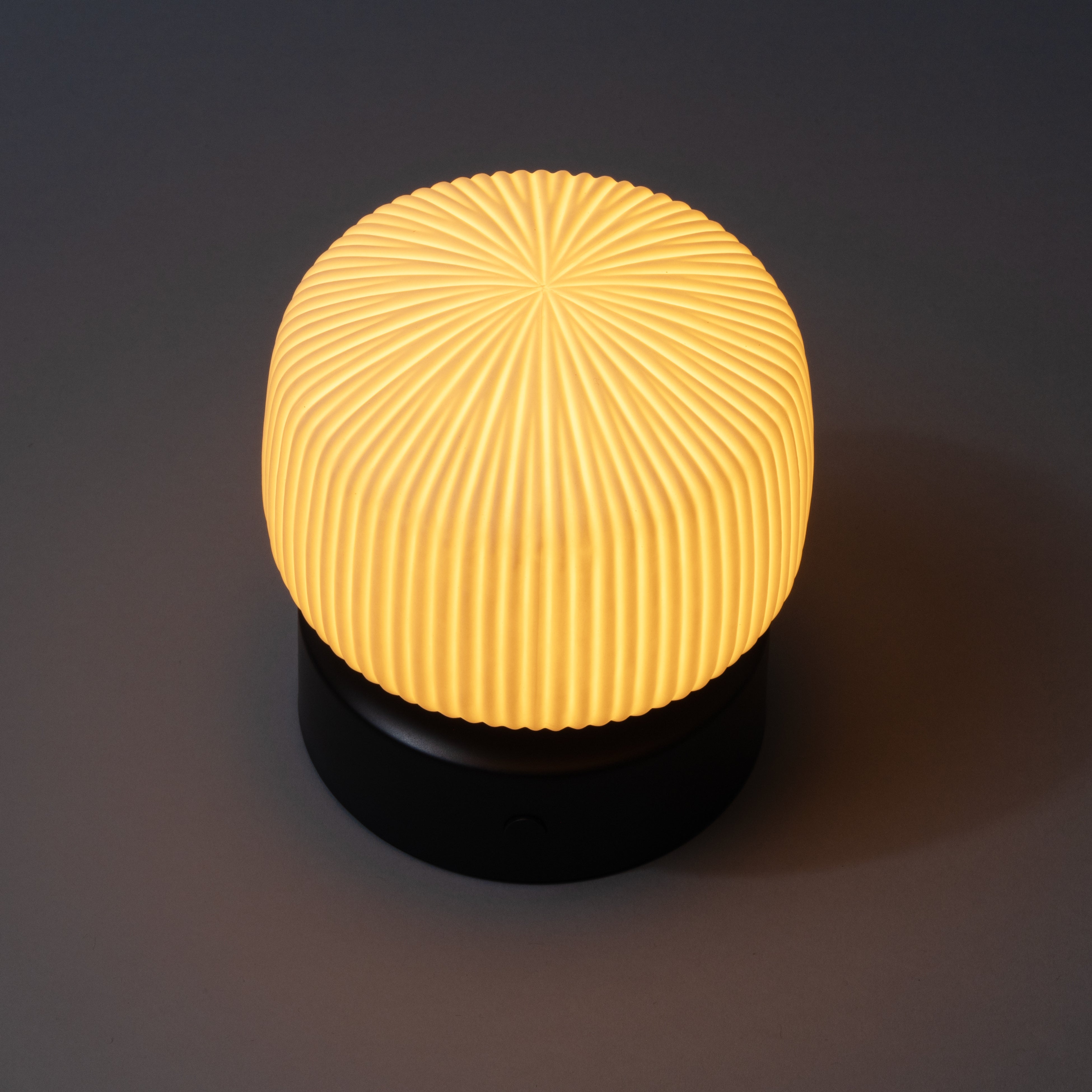 磁器シェードだからこそ生まれる美しい光を置き照明として作家と共同開発した。