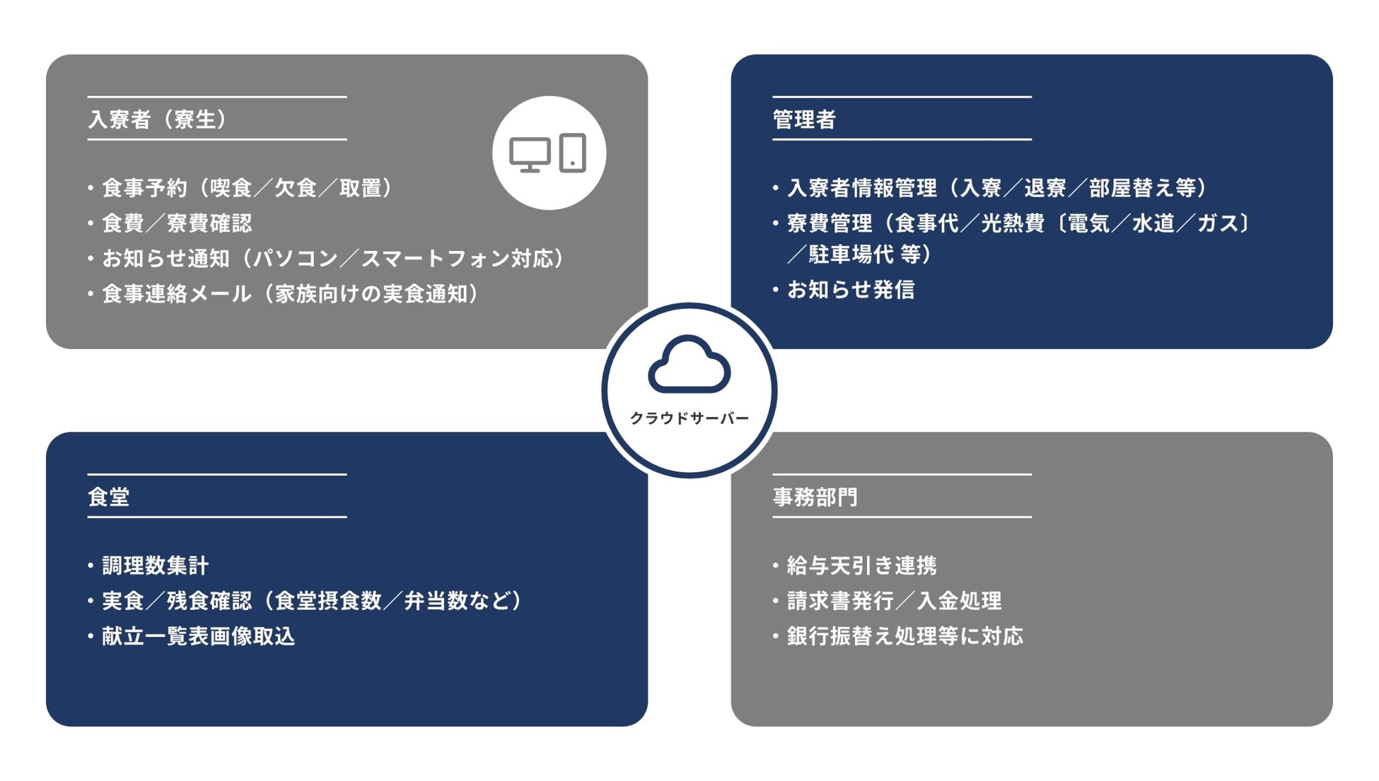 寮をご利用の社会人や学生の方を始め、寮の管理人様、寮食を準備する厨房担当者様、そして寮の運営会社様のお悩みを解決いたします。