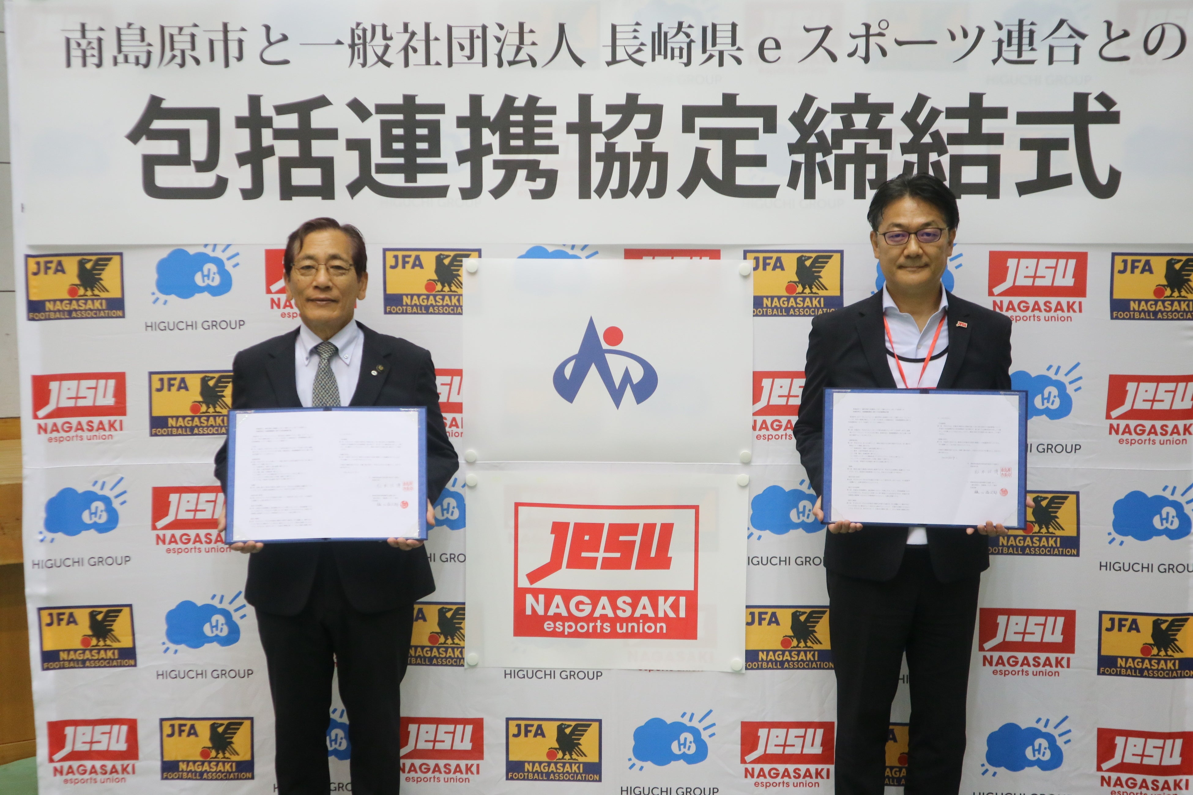 (左から:南島原市 松本市長、一般社団法人長崎県eスポーツ連合 内野業務執行理事)