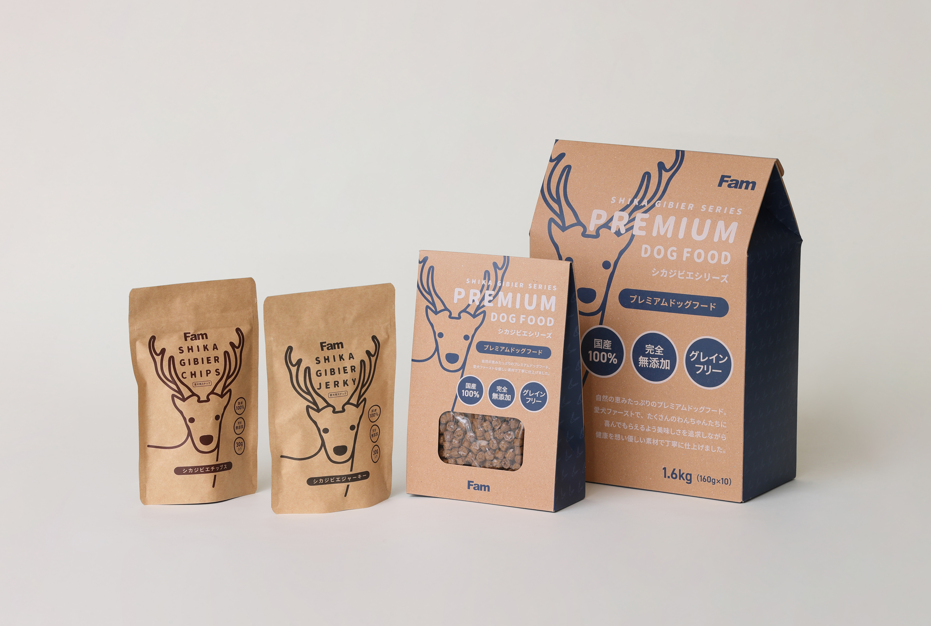 (左からFamシカジビエチップス/ジャーキー、Famシカジビエシリーズ プレミアムドッグフード160g/1.6kg入り)