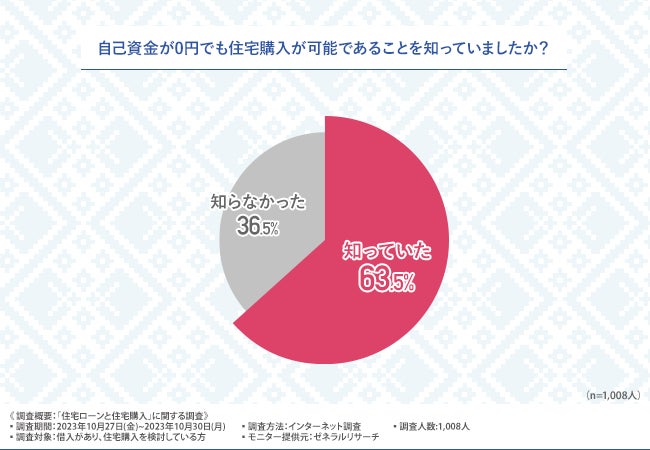 頭金の用途、必要性が分かったところで、今度は「自己資金が0円でも住宅購入が可能であることを知っていましたか?」と質問したところ、約3割の方が『知らなかった(36.5%)』と回答しました。