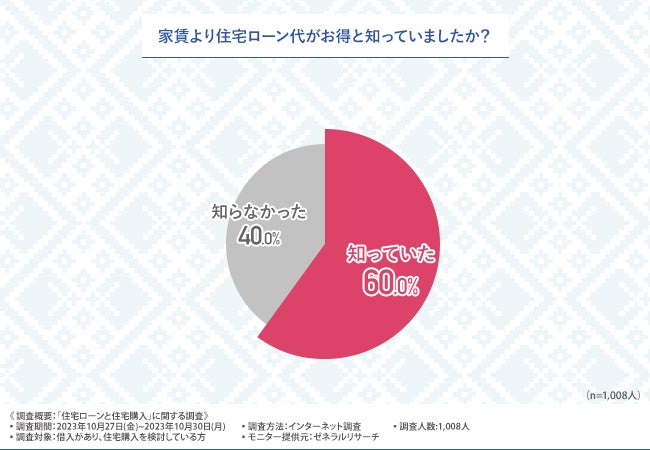 「家賃より住宅ローン代がお得と知っていましたか」と質問したところ、4割の方が『知らなかった(40.0%)』と回答しました。