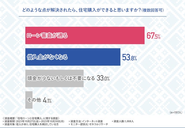 「どのような点が解決されたら、住宅購入ができると思いますか?(複数回答可)」と質問したところ、『ローン審査が通る(67.5%)』と回答した方が最も多く、次いで『既存の借入金がなくなる(53.8%)』『頭金が少ないもしくは不要になる(33.0%)』と続きました。