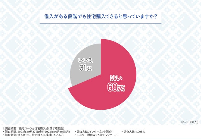 「借入がある段階でも住宅購入できると思っていますか?」と質問したところ、およそ3割の方が『いいえ(31.3%)』と回答しました。