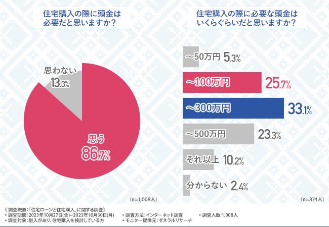 「住宅購入の際に頭金は必要だと思いますか?」と質問したところ、およそ9割の方が『思う(86.7%)』と回答しました。