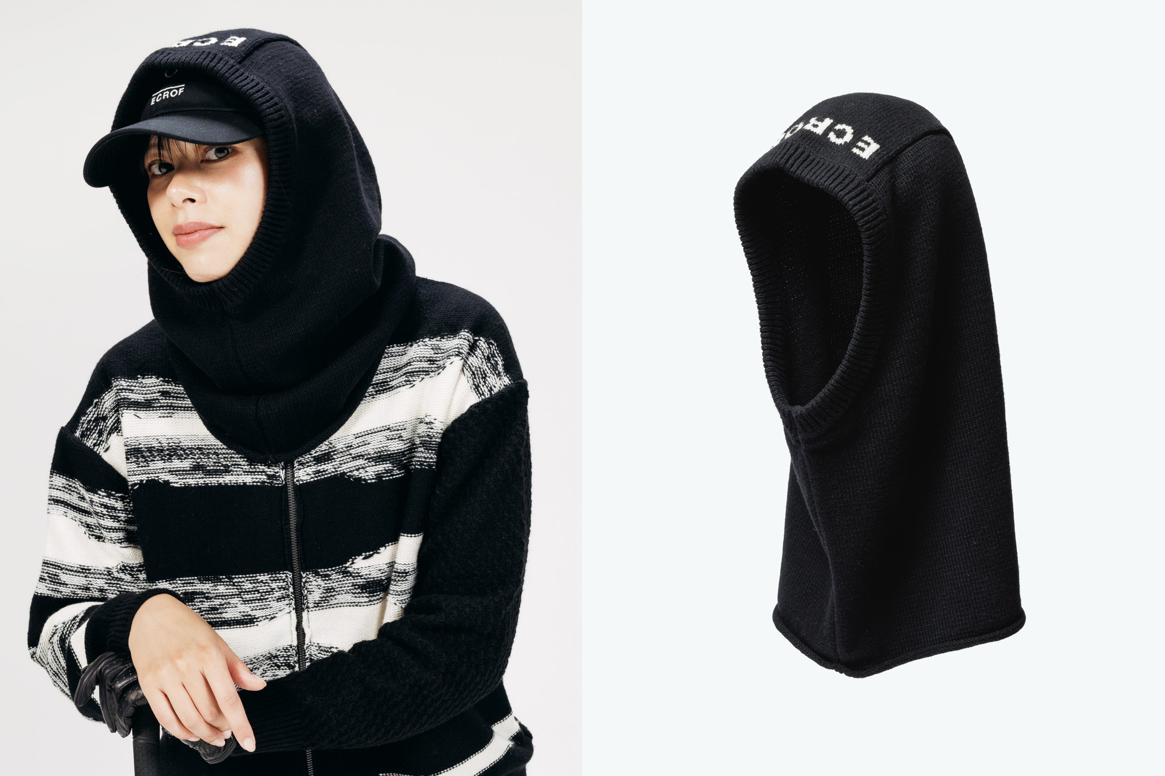 フードを被って、寒さ対策ができるニットバラクラバ。普段はネックウォーマーとして使用することもでき、ECROFオリジナルの定番キャップとあわせるのもおすすめです。¥14,300 tax in