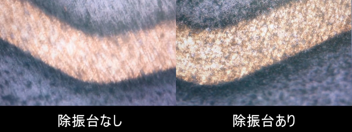 以下は、重りをつけた歯車を1000rpm(※16.7Hz)で回転させて振動を発生させ、倍率1000倍の電子顕微鏡から映された画面の比較画像です。