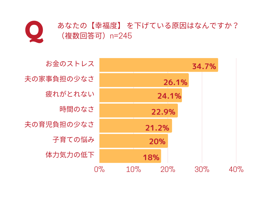 「あなたの幸福度を下げている原因は?」(複数回答可)と聞いたところ、一番多かった回答は「お金のストレス」で34.7%でした。次に多かったのは「夫の家事負担の少なさ」で26.1%、次が「疲れが取れない」で24.1%でした。育児や家事に追われ、自分に時間を割けないことや、疲労の蓄積がママの幸福度を下げていることがわかります。