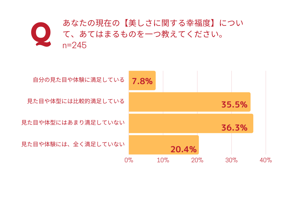 【美しさに関する幸福度】の質問では半数以上の56.7%が自分の見た目や体型に不満があると回答しました。