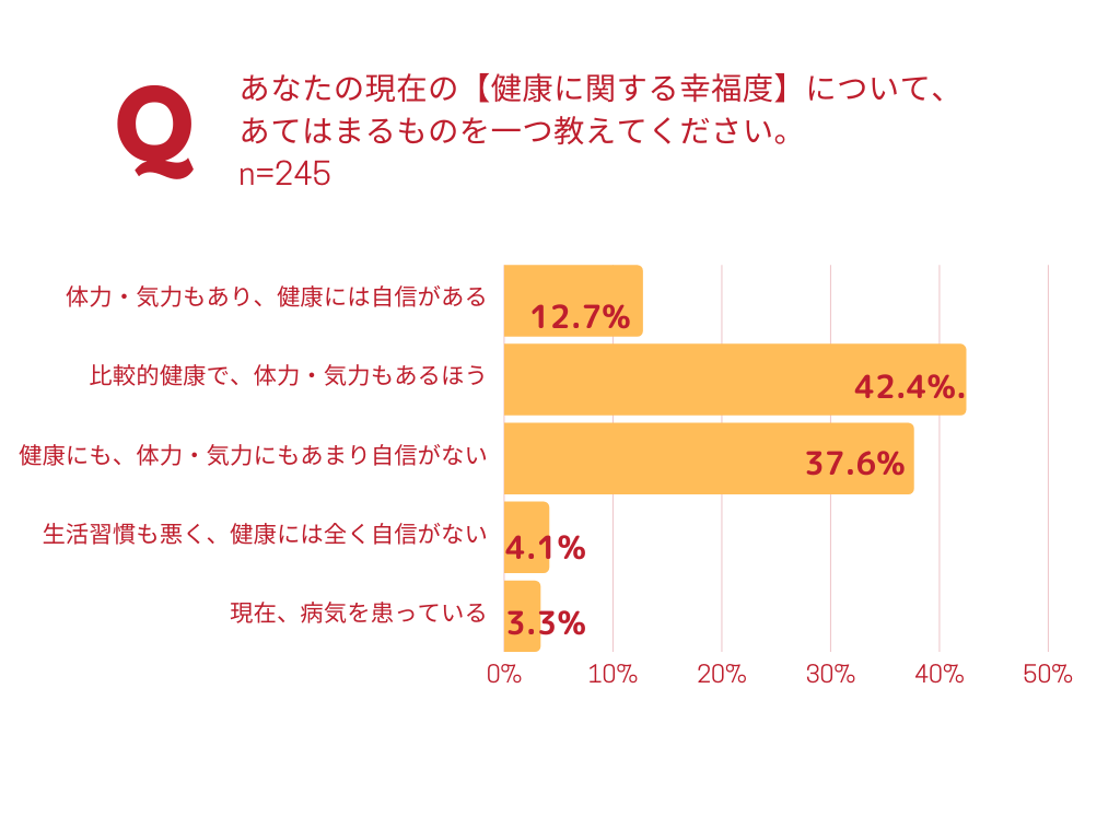 しかし【健康に関する幸福度】の質問では、全体の55.1%が「健康(体力・気力含む)に自信がある/比較的自信がある」と回答した一方で、41.7%が「健康にも体力・気力にもあまり自信がない/全く自信がない」と回答し、3.3%は病気を患っていると回答しました。スポーツ庁が毎年実施している「体力・運動能力調査」でも、30代、40代女性は「1週間で一日もスポーツをしない」に該当する人が5割を超え、前年度と比較しても増加傾向にあることも明らかになっています。