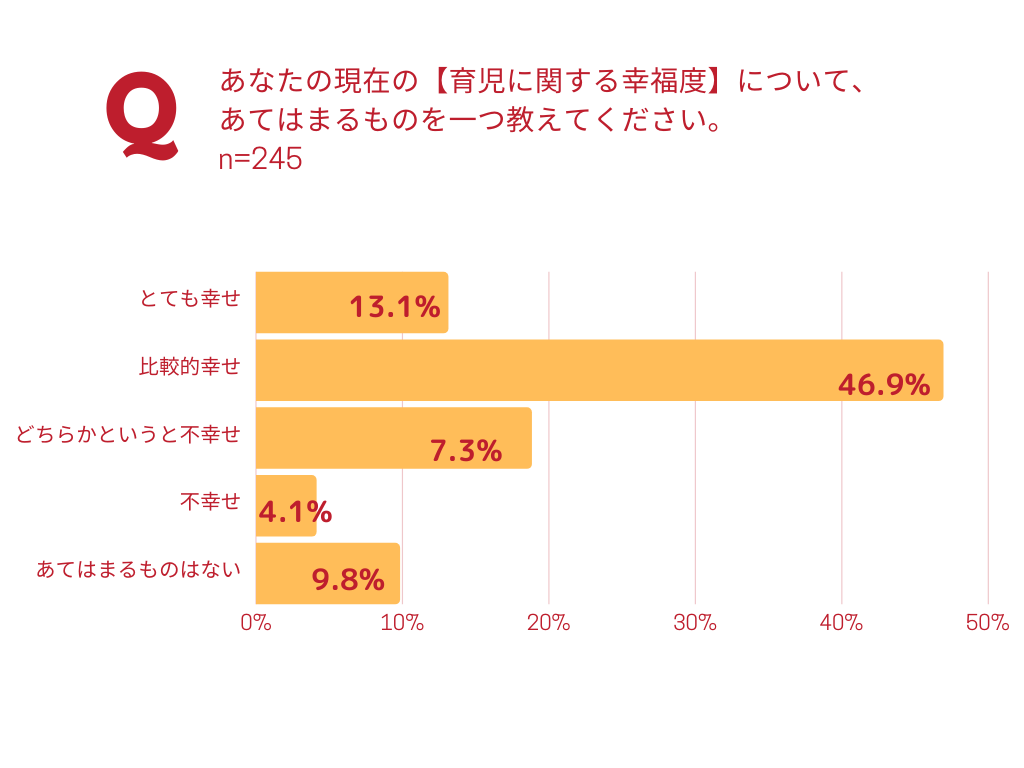 育児に関する幸福度の質問では「とても幸せ/比較的幸せ」と回答した人が60%で、「どちらかというと不幸せ/不幸せ」と回答した人は全体の11.4%でした。