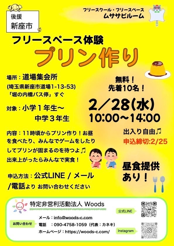 特定非営利活動法人Woods(ウッズ)による不登校児童のための無料の居場所学習支援「ムササビルーム」(埼玉県新座市道場)が居場所体験イベントを開催します。