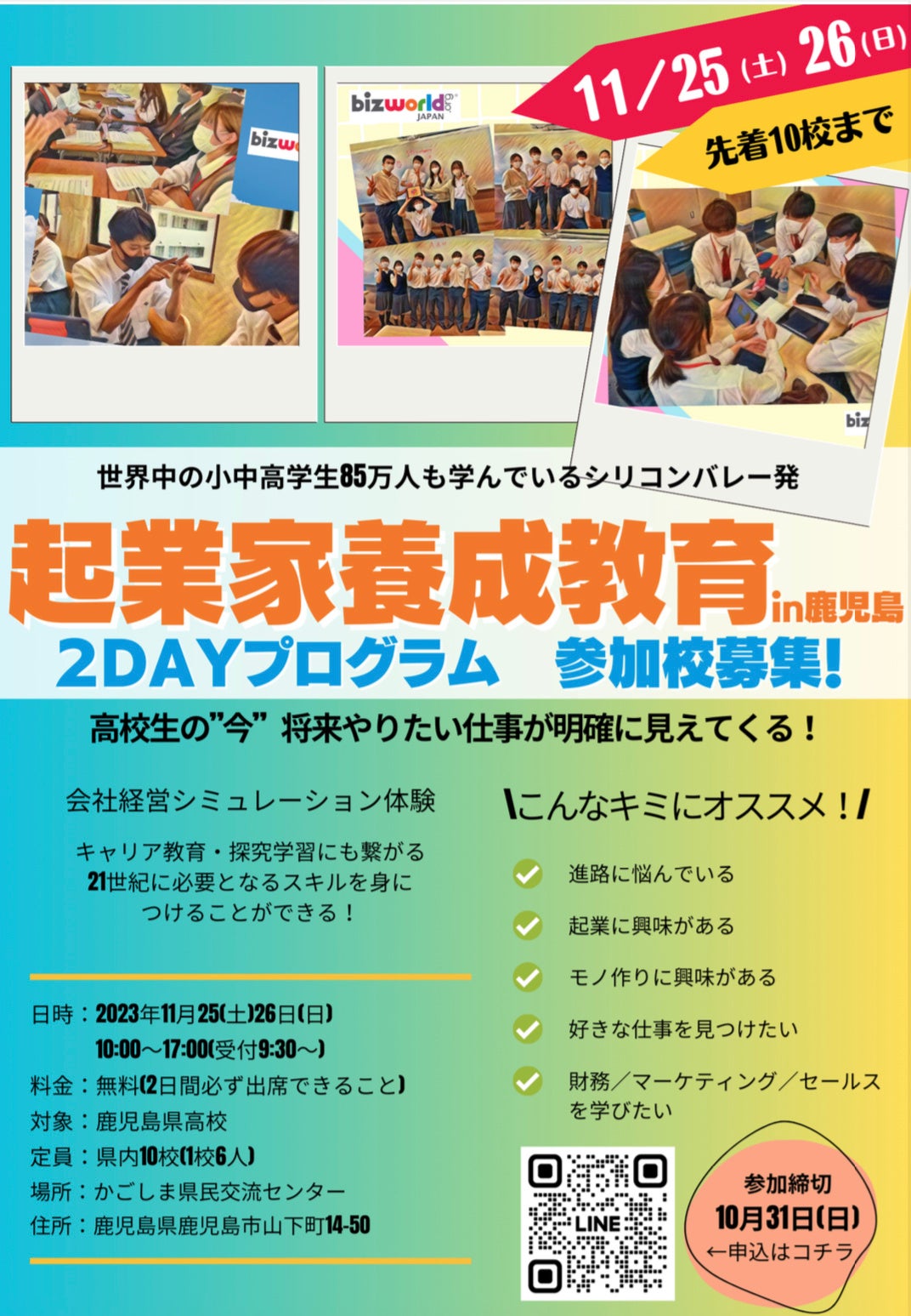 株式会社コラソンはシリコンバレーで生まれた起業家育成プログラム「Biz world」を鹿児島県の高校生を対象に11月25日、26日の2日間開催します。イベントは県内から選抜された10校がスキルを競う対抗戦形式。世界中85万人の学生が受講する最先端教育が遂に鹿児島に!