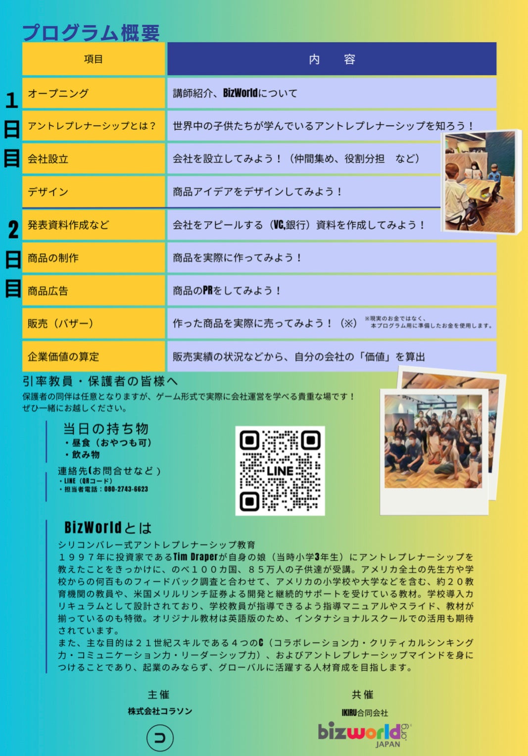 すでに100カ国80万人が受講、20年以上の歴史。公教育にも導入。日本初導入となる『BizWorld』は、アメリカシリコンバレーで生まれた起業家教育プログラムである。投資家Tim Draper(ティム・ドレイパー)が、自分の娘に「起業家ってどんな仕事?」と聞かれたのをきっかっけに、当時娘が熱中していたミサンガ作りをヒントにプログラムを開発。未来の子どもたちには、アントレプナーシップが必要であることを唱え、投資家でありながらも、実践を通してアントレプレナーシップを学ぶDraper大学を設立したり、教育委員会で勤務した経歴をも持つ。プログラムでは、子どもたちが6人のグループでそれぞれの持ち味を生かしながらチームで会社を設立し経営していく。このプログラムは起業家を育成することだけが目的ではなく、VUCA時代を生き抜くために必要なアントレプレナーシップの育成を目的にしている。プログラムを通して実社会とつながり、よりよい社会に変えたいと思えるマインドの育成を目指す。