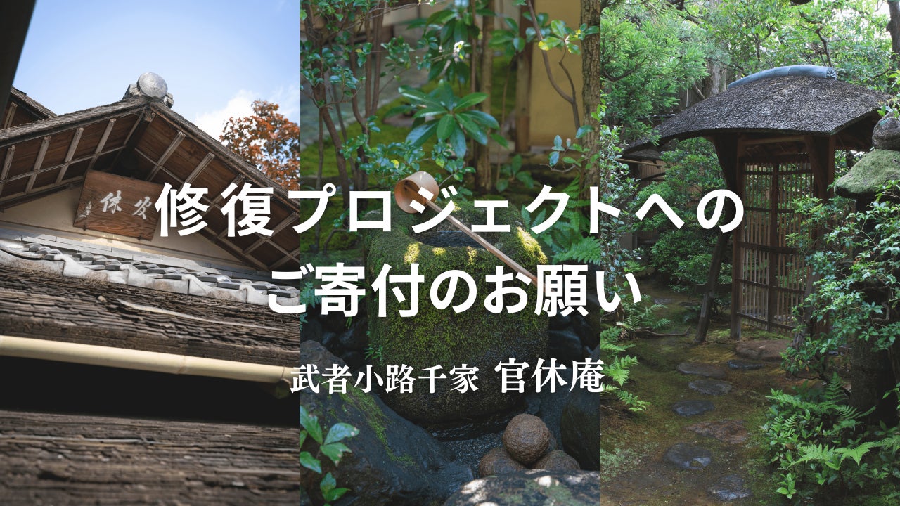 千利休より約450年に亘り茶の湯の真髄を伝えてきた武者小路千家官休庵。その基幹となるべき家元茶室は傷みを増し、旧学院棟の老朽は深刻な状態で、修繕と改築は喫緊の課題です。2025年官休庵開祖一翁宗守350年忌を迎えるにあたり伝統を守り、生きる茶の湯を今に伝え未来につなぐため、本企画への皆様のご賛同とご参加をぜひお願い申し上げます。