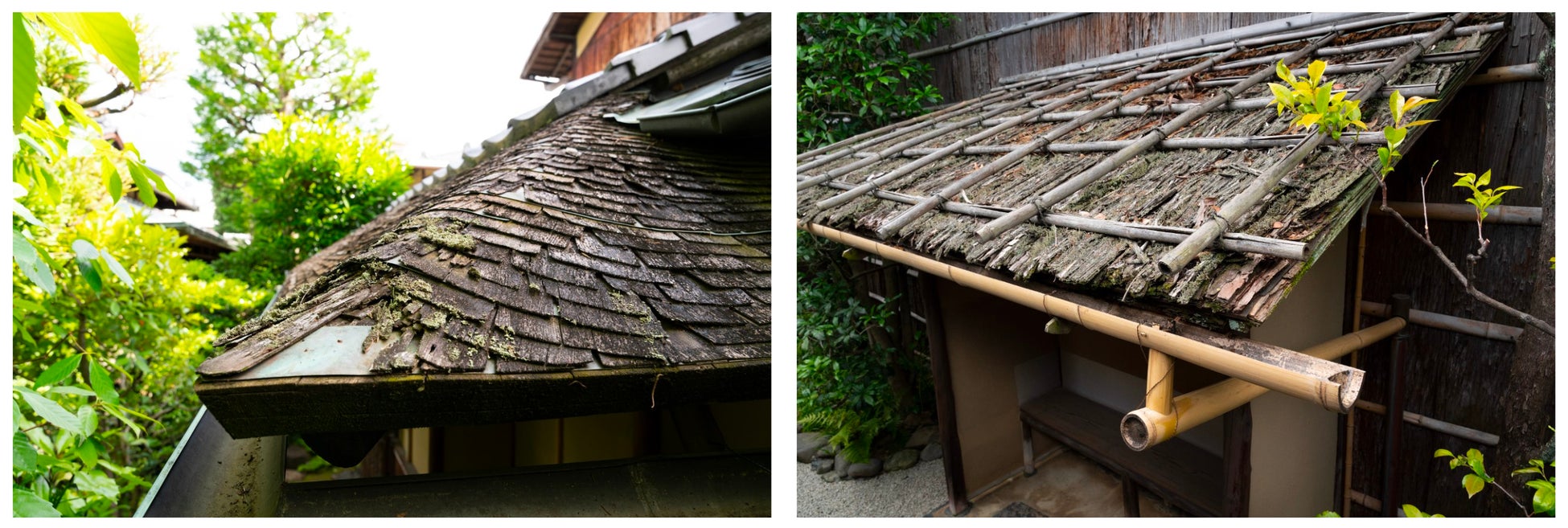 創建と再建を繰り返した各茶室も多くの箇所で老朽化が見られるように。屋根や建物各所に損傷が見られます。