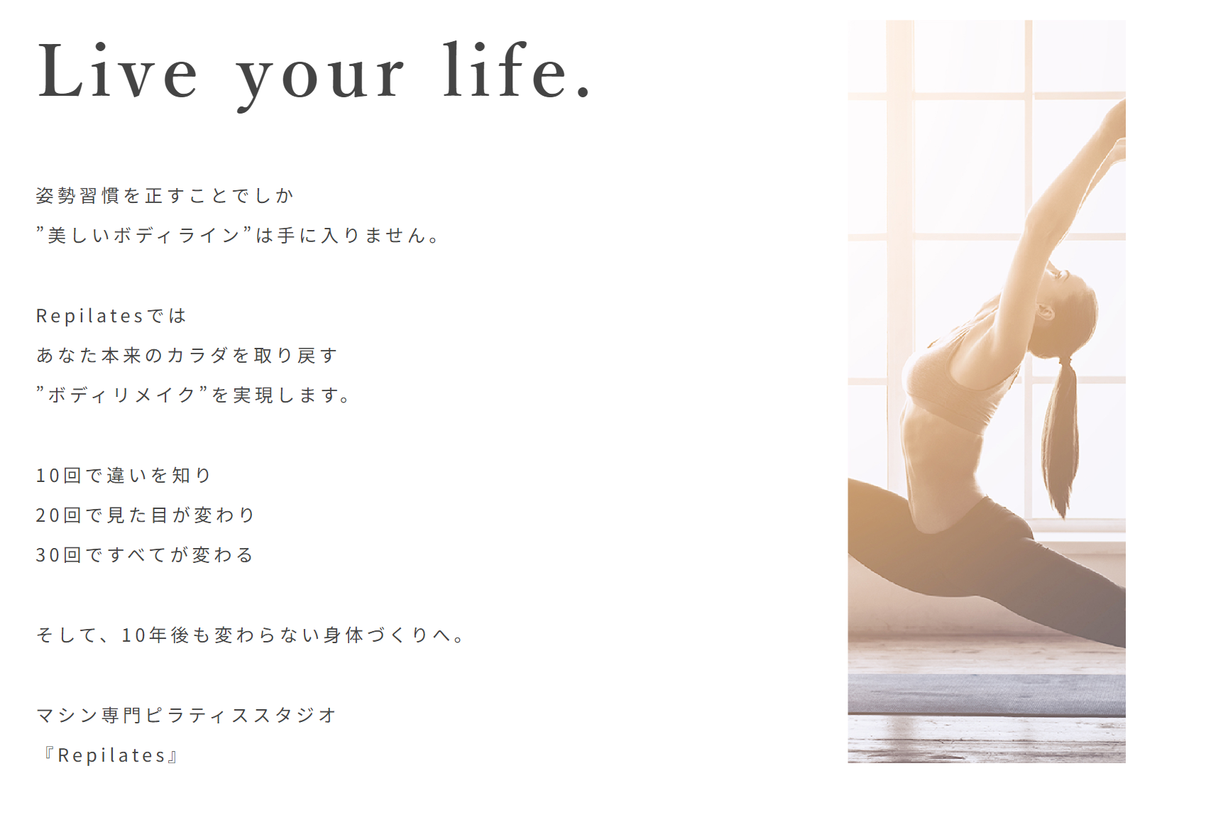 「再び」「アップデート」を意味する“Re”+”pilates”を結合した店名「Repilates」は、ピラティスのプログラムを通じて自身のカラダに向き合い、行動・習慣に変化をあたえ、良い状態をキープしていく為のサービスを展開致します。