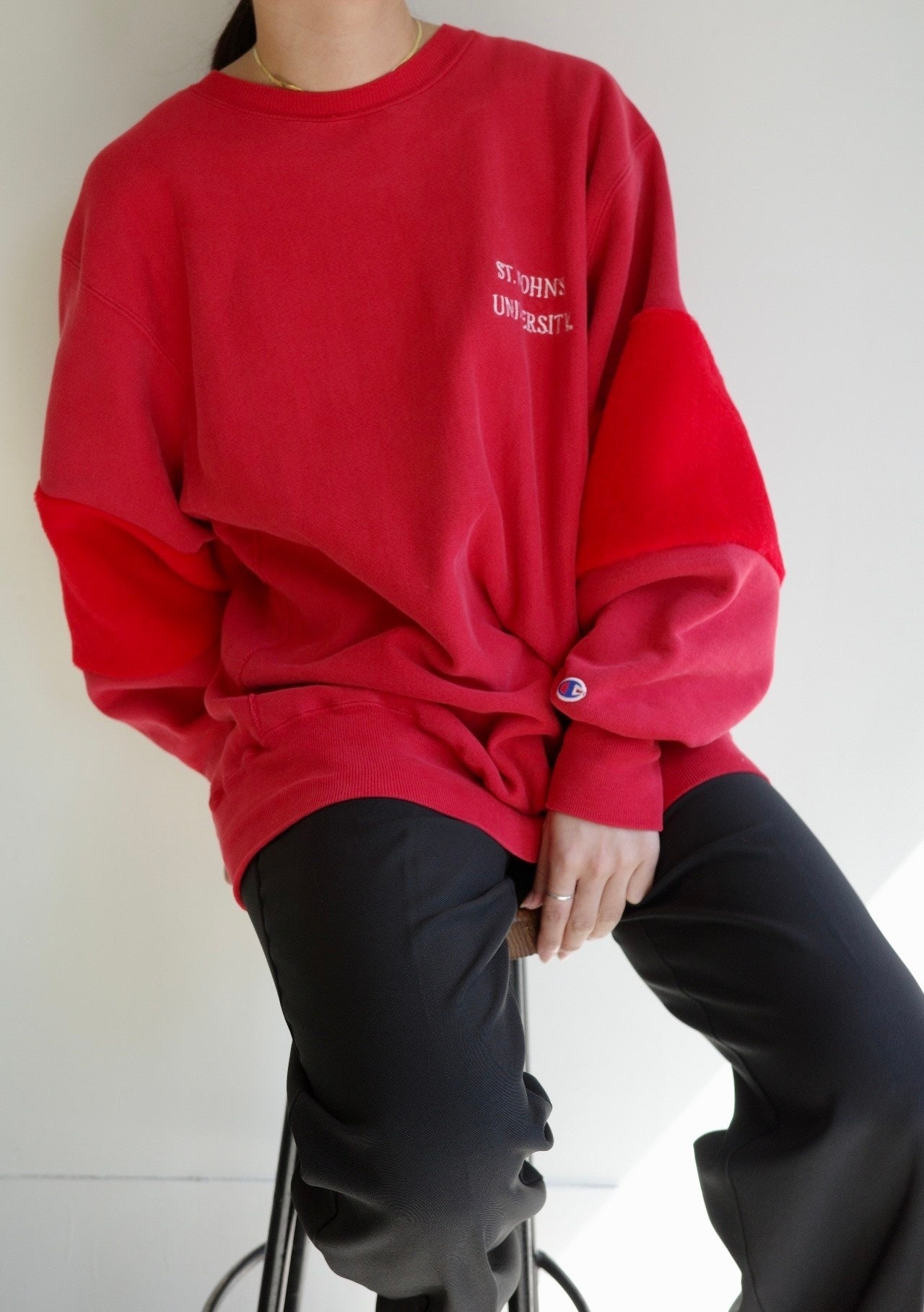 Red sweatshirt ¥26,400-(税込) 「BELLEDE」の在庫で袖に汚れがあったヴィンテージスエットを袖の部分にボアの残布を組み込み立体感のあるアイテムにリメイク。
