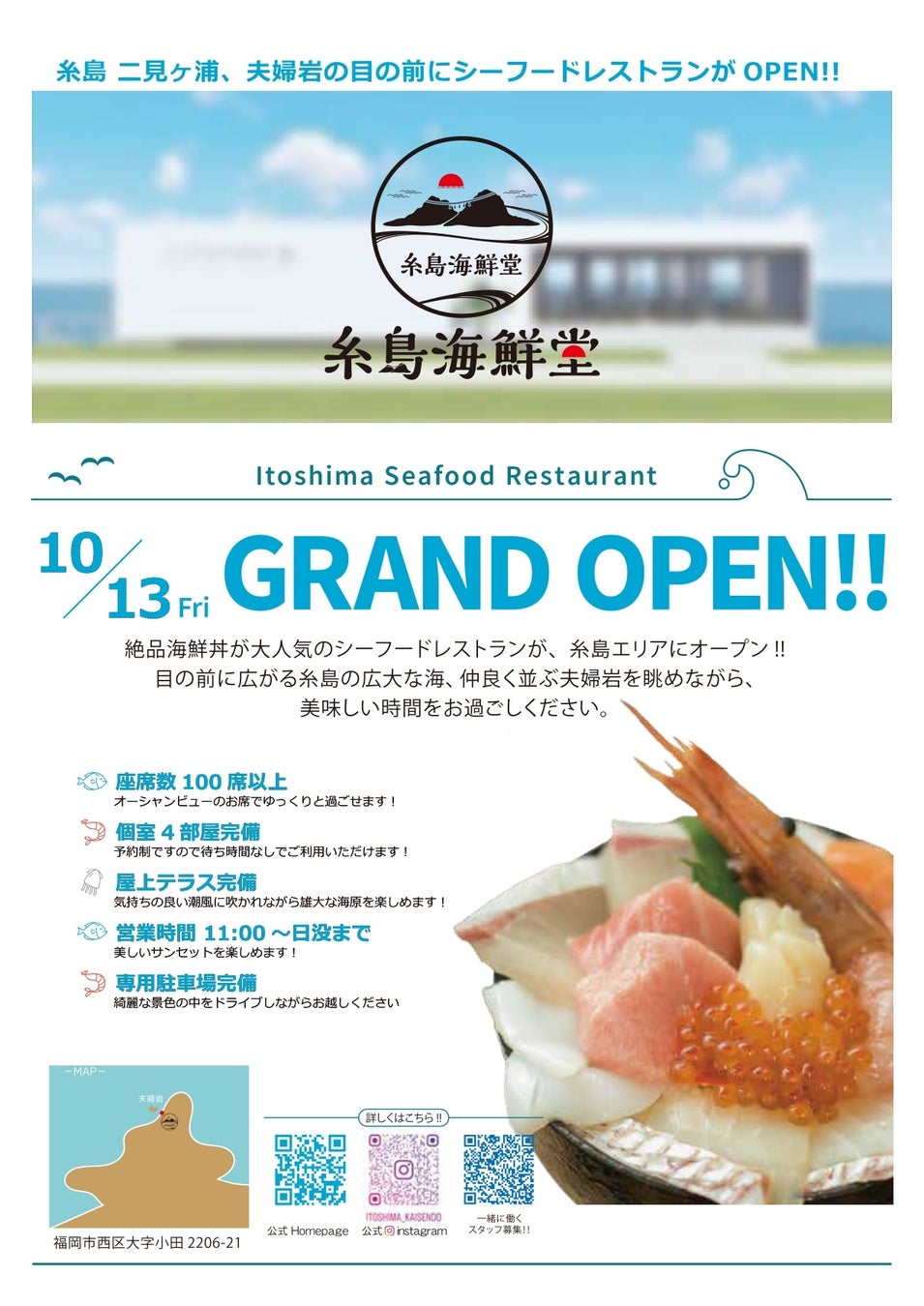 2023年10月13日(金)11時~糸島・桜井二見ヶ浦に、玄界灘(九州・山口)で獲れた新鮮な魚介を使用した海鮮丼や糸島野菜などの地元食材を使用した料理を提供する『糸島海鮮堂 二見ヶ浦本店』をオープンいたします。