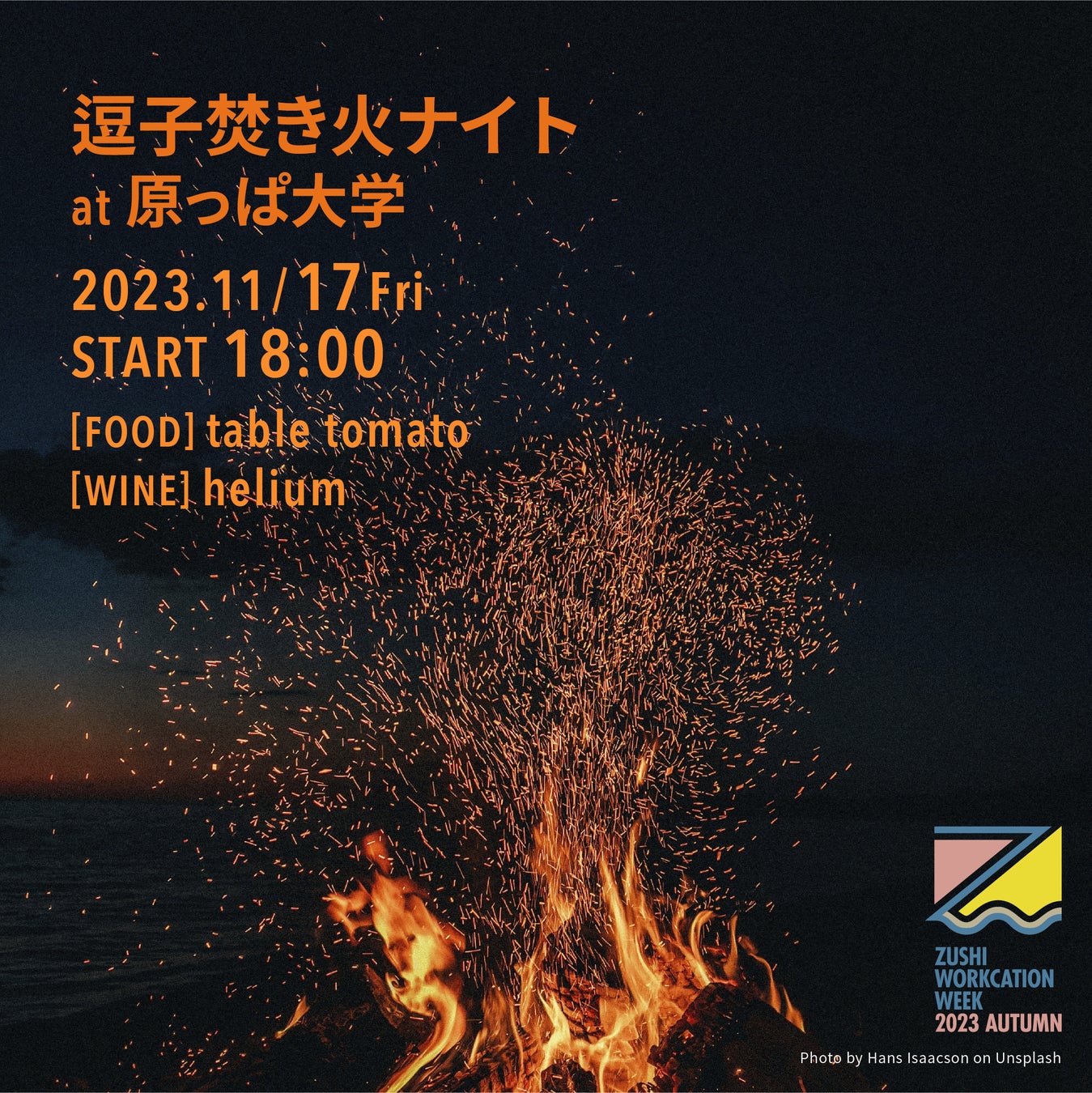 金曜の夜に仕事を終えて、逗子の森で焚き火を眺めながらディナーを楽しむスペシャルイベント。