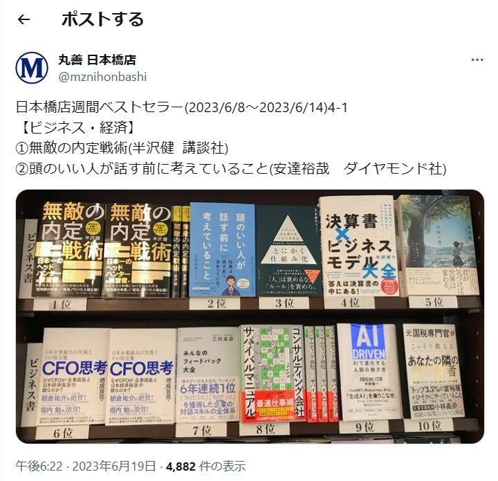 丸善東京日本橋店にてウィークリーランキング1位獲得![ジャンル:ビジネス書、2023/6/18(日)発表分]