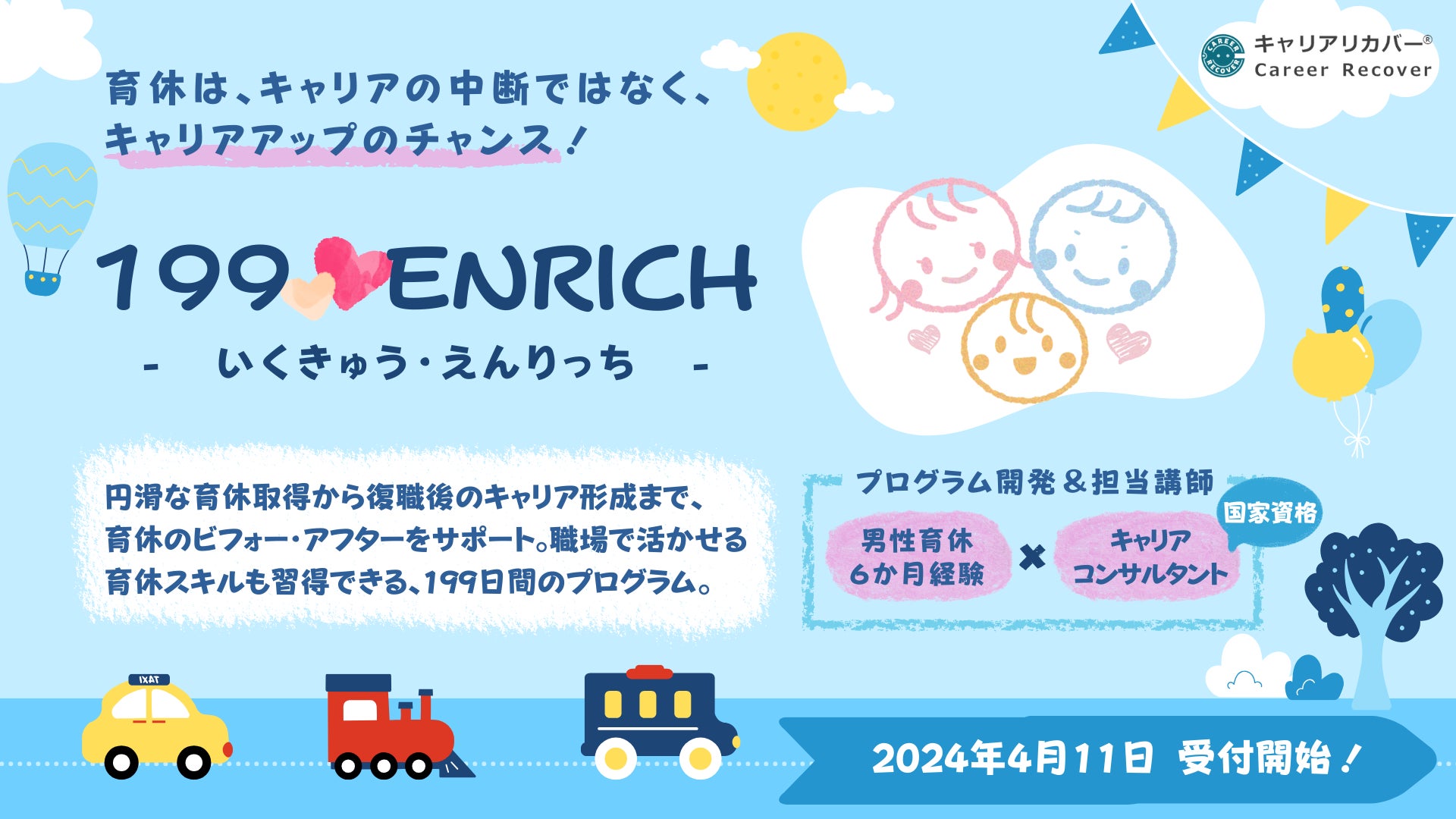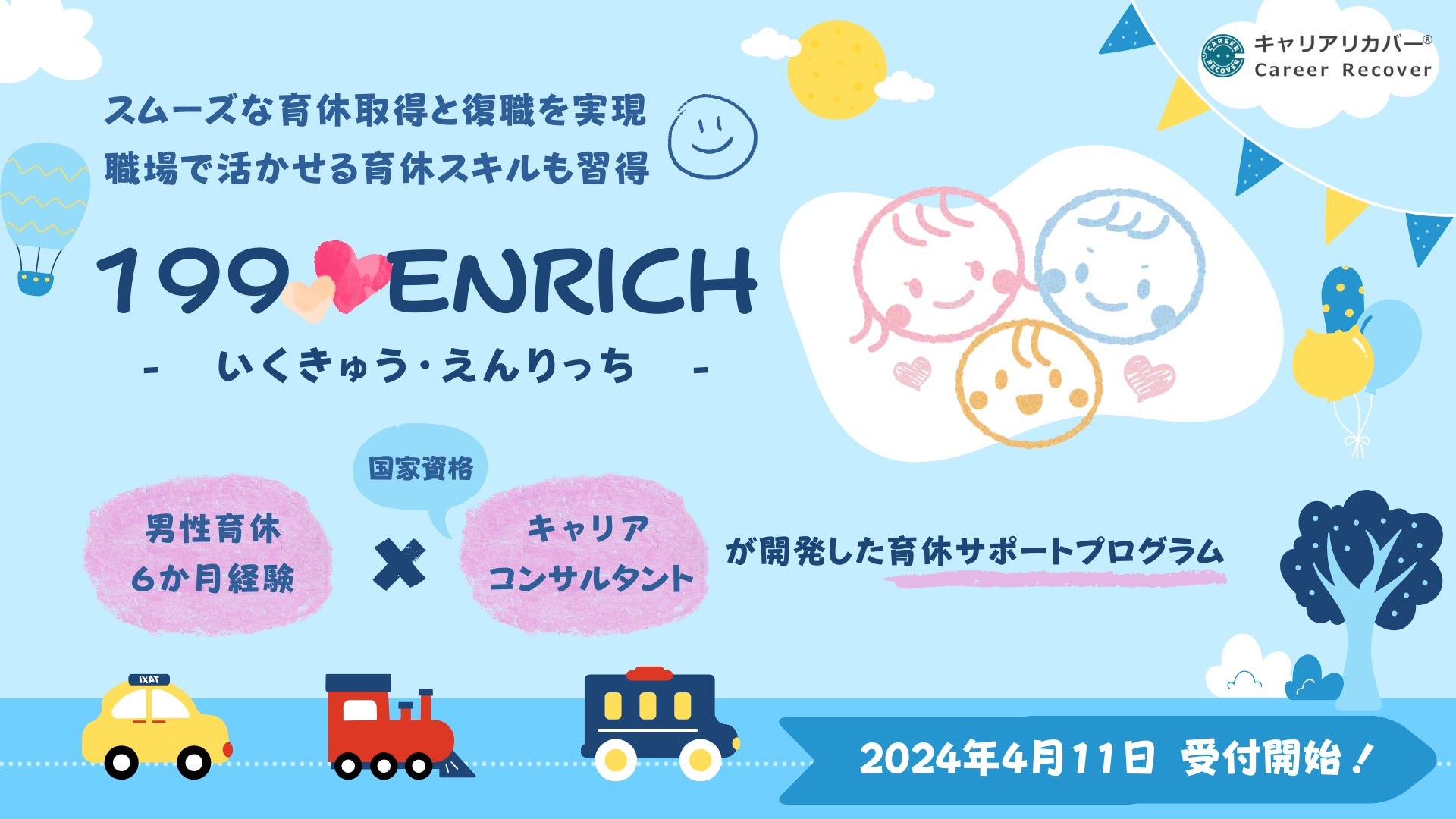 キャリアリカバー(所在地:東京都千代田区 代表:堀 左馬之介)は、育休取得とキャリア形成を全面的にサポートするプログラム「199 Enrich」(イクキュウ・エンリッチ)を、2024年4月11日にリリースします。このプログラムは、男性育休6か月の経験を持つ国家資格キャリアコンサルタントが、育休取得を考えている男女を対象に、育休生活のプランニング、育休の円滑な取得方法、育休中の家庭での過ごし方、復職後のキャリア形成まで、育休前後に起こりうる課題を全面的にサポートするものです。