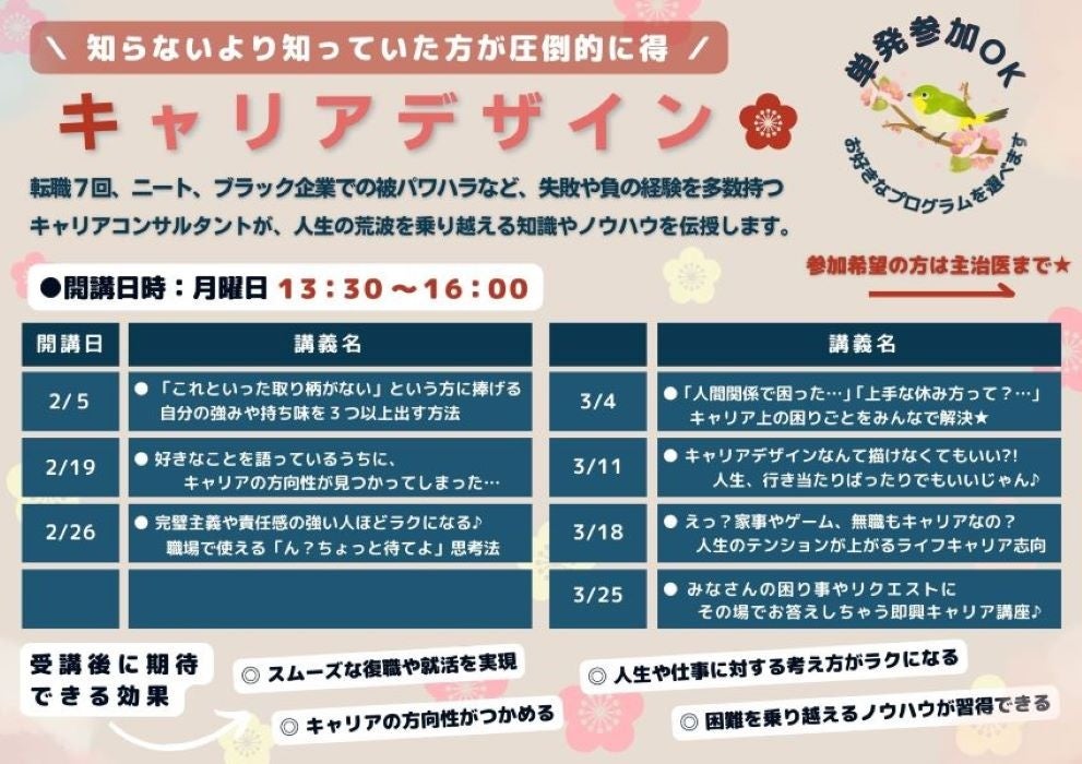 心療内科クリニックにおいて、精神疾患や発達課題のある患者を対象に、早期復職や就職を目指したキャリア関連のプログラムおよびキャリアカウンセリングを実施