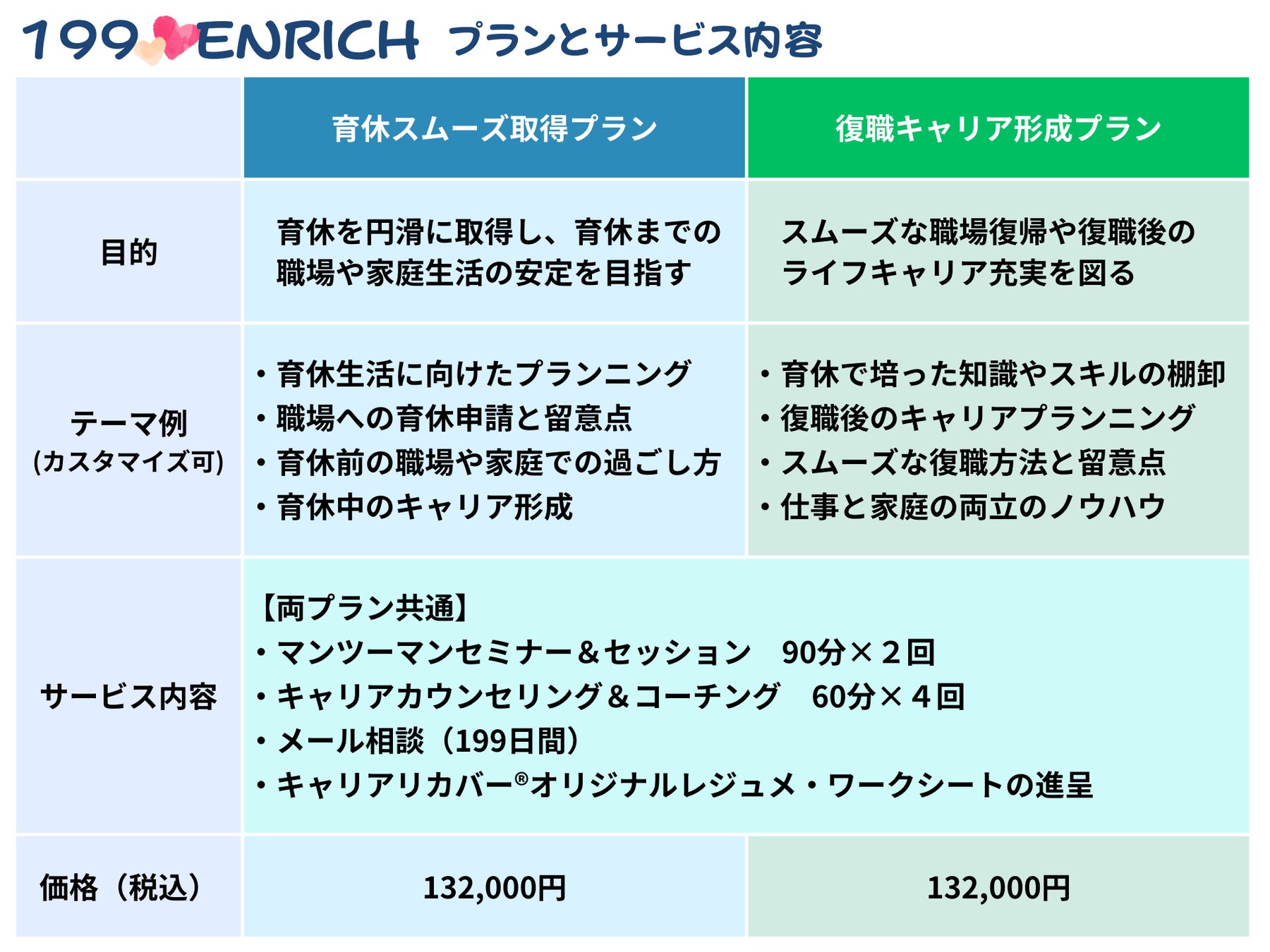 このような背景から、キャリアリカバーでは育休取得検討中の男女を対象とした、円滑な育休取得から復職後のキャリア形成までを全面的にサポートしたプログラム「199 Enrich」を開始することになりました。