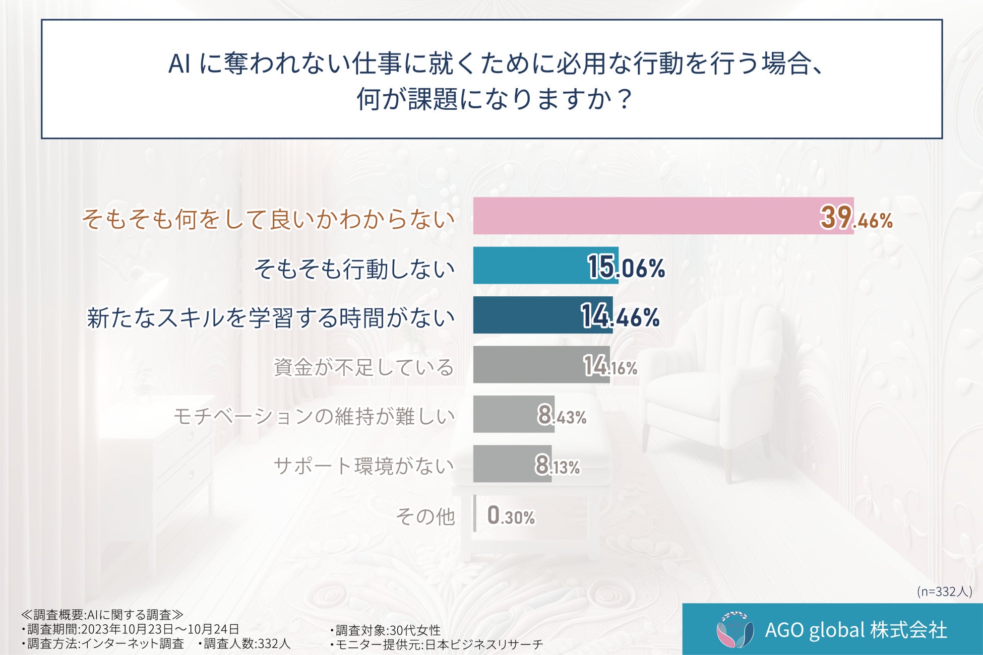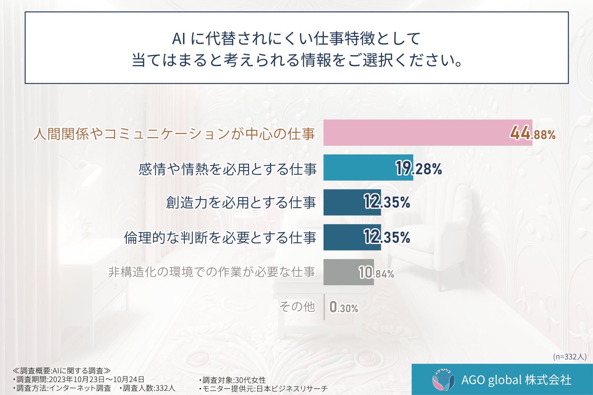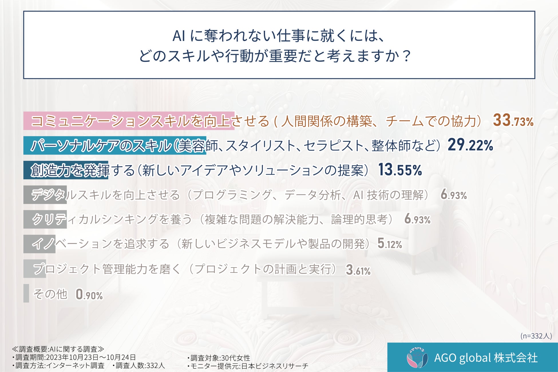 そこで、AGO global株式会社(URL:https://www.agoglobal.co.jp/)は、AIに代替されにくい仕事の特徴や、それらの仕事に就くために必要な要素について意識調査を実施しました。