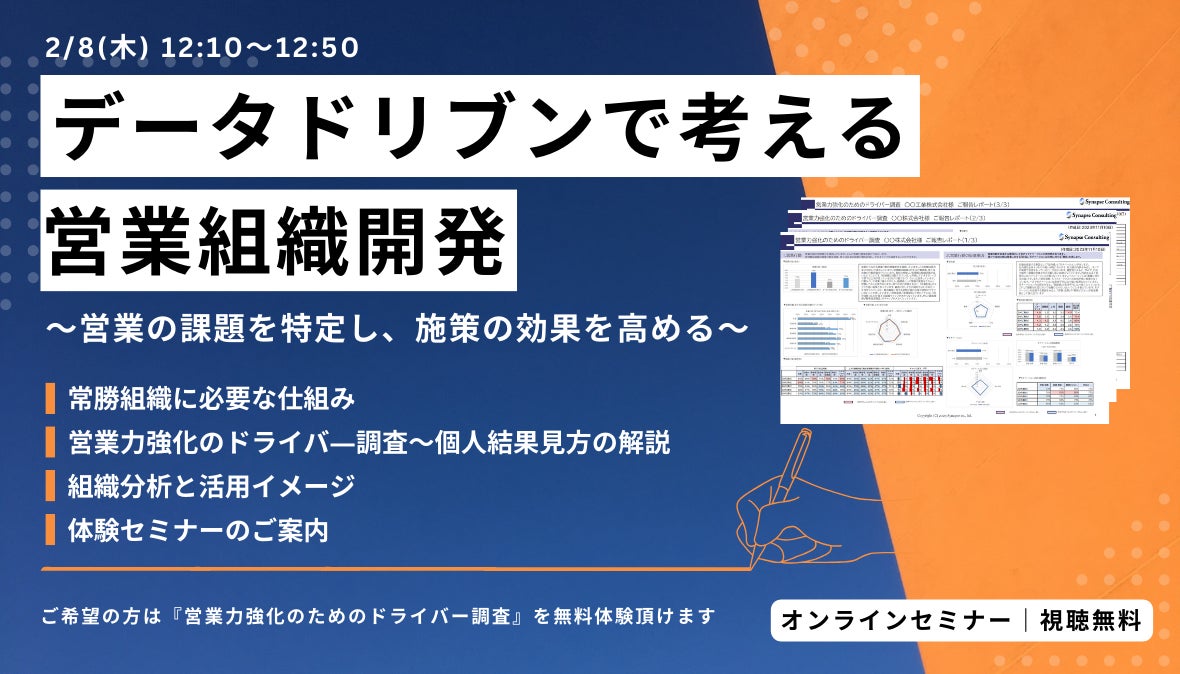 本セミナーでは、「営業力強化のドライバー調査」を一部体験いただきながら、データドリブンで考える営業組織開発の考え方をご紹介させていただきます。