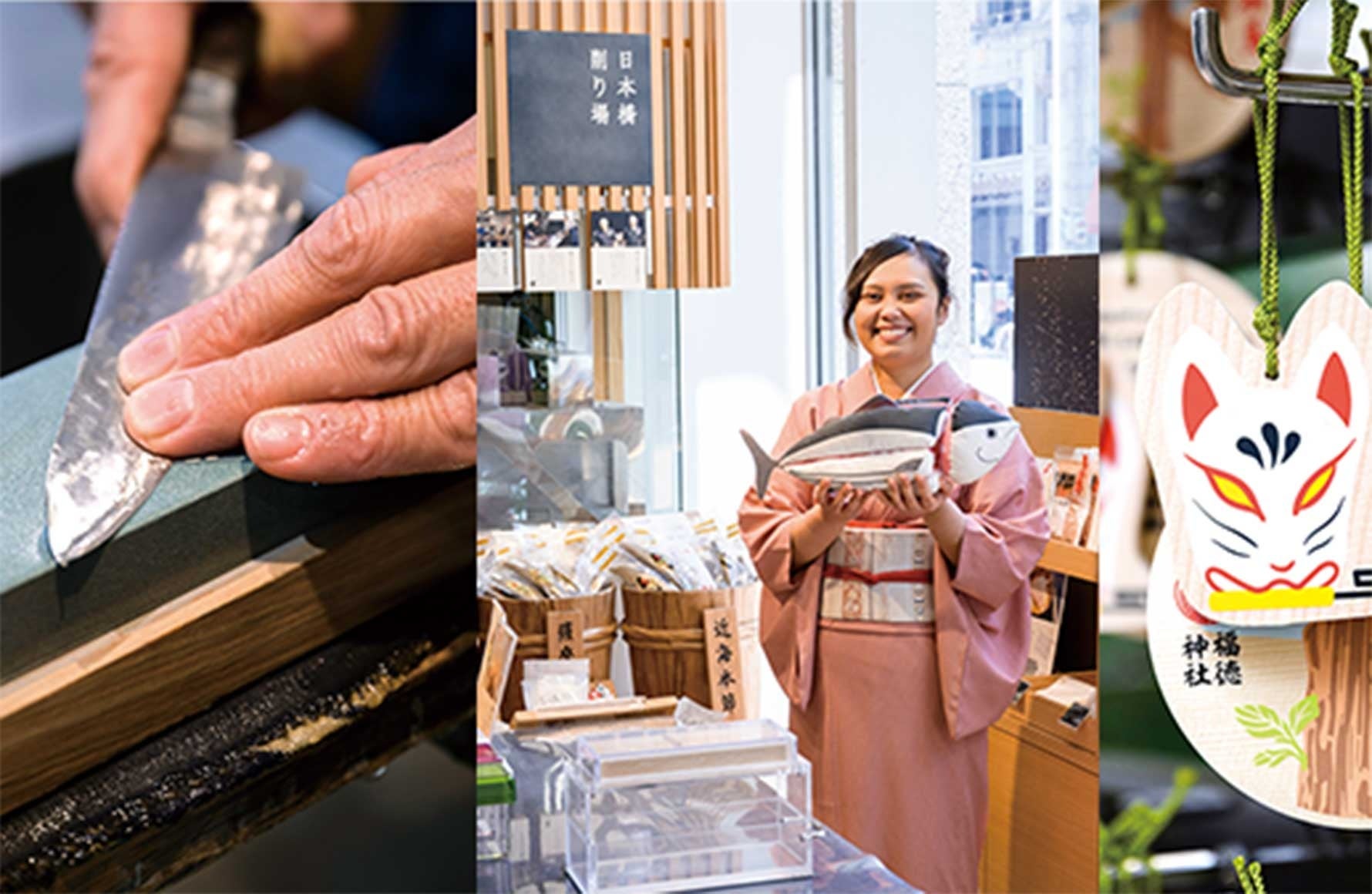 日本橋案内所と連携して、前半は「江戸文化体験ツアー」と題した日本橋ならではの体験を交えたガイドツアーを外国人コンシェルジュが行います。