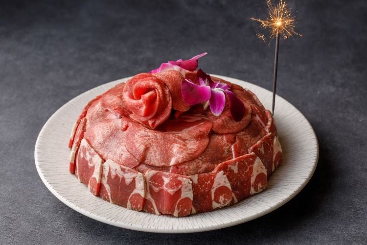 誕生日や記念日にはサプライズで肉ケーキやオリジナルバースデイプレート等をご用意できます。色鮮やかな赤身肉のインパクトはサプライズにピッタリ!円形に積まれた国産牛には、「今後の関係が円満になるように」という願いが込められています。