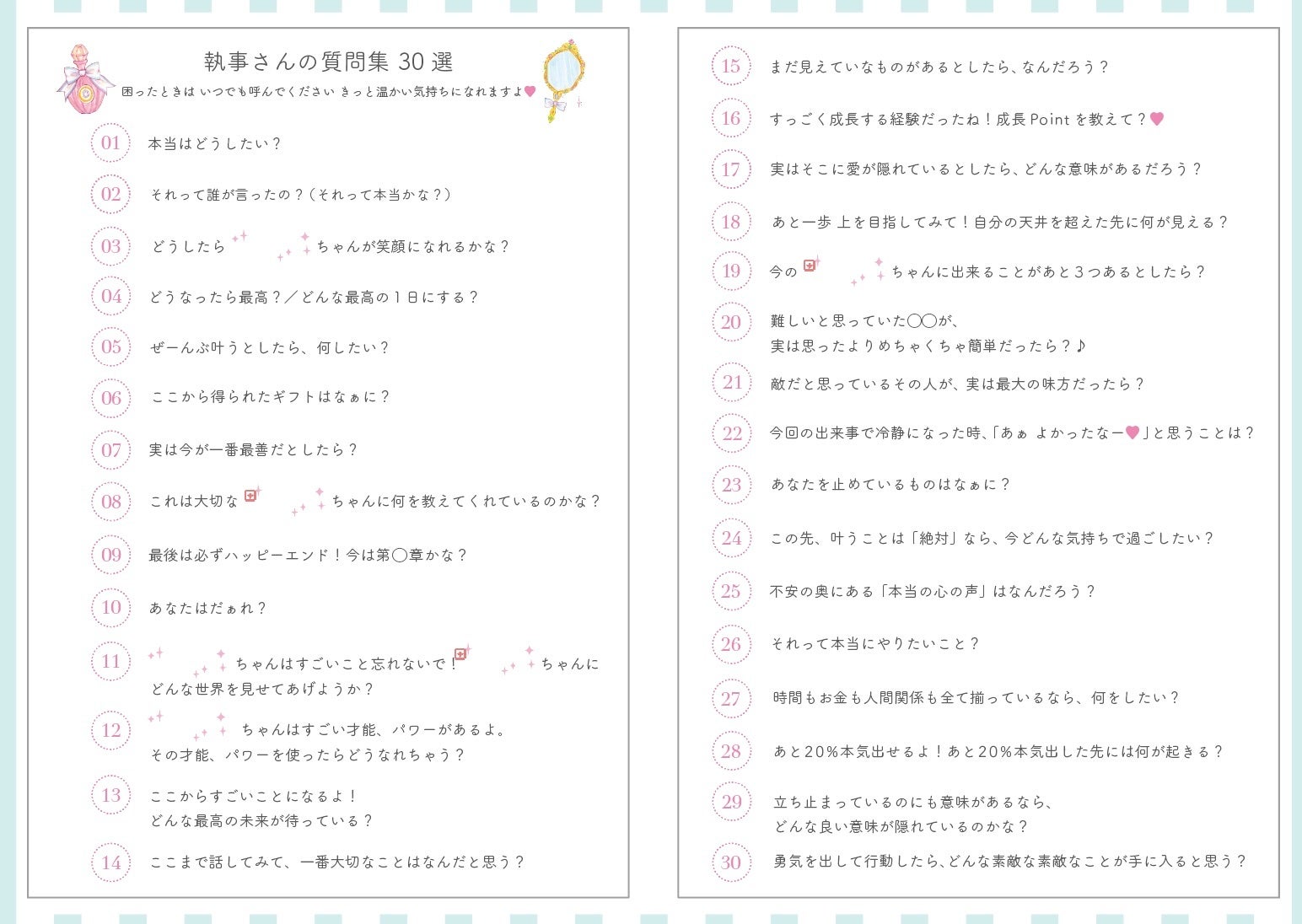 絶対的味方の執事さんに共感してもらうことで、幸せホルモンが分泌され、愛でいっぱいになったり、執事さんに良質な質問をしてもらうことで、望まない思い込みを手放すことができ、良い考え方ができるようになります。