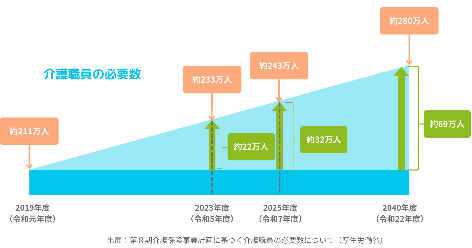 一方で、介護職員数は、2019年度に211万人でしたが、必要数としては2025年に243万人、2040年には280万人と算出されており、一層の人材不足が懸念されます。