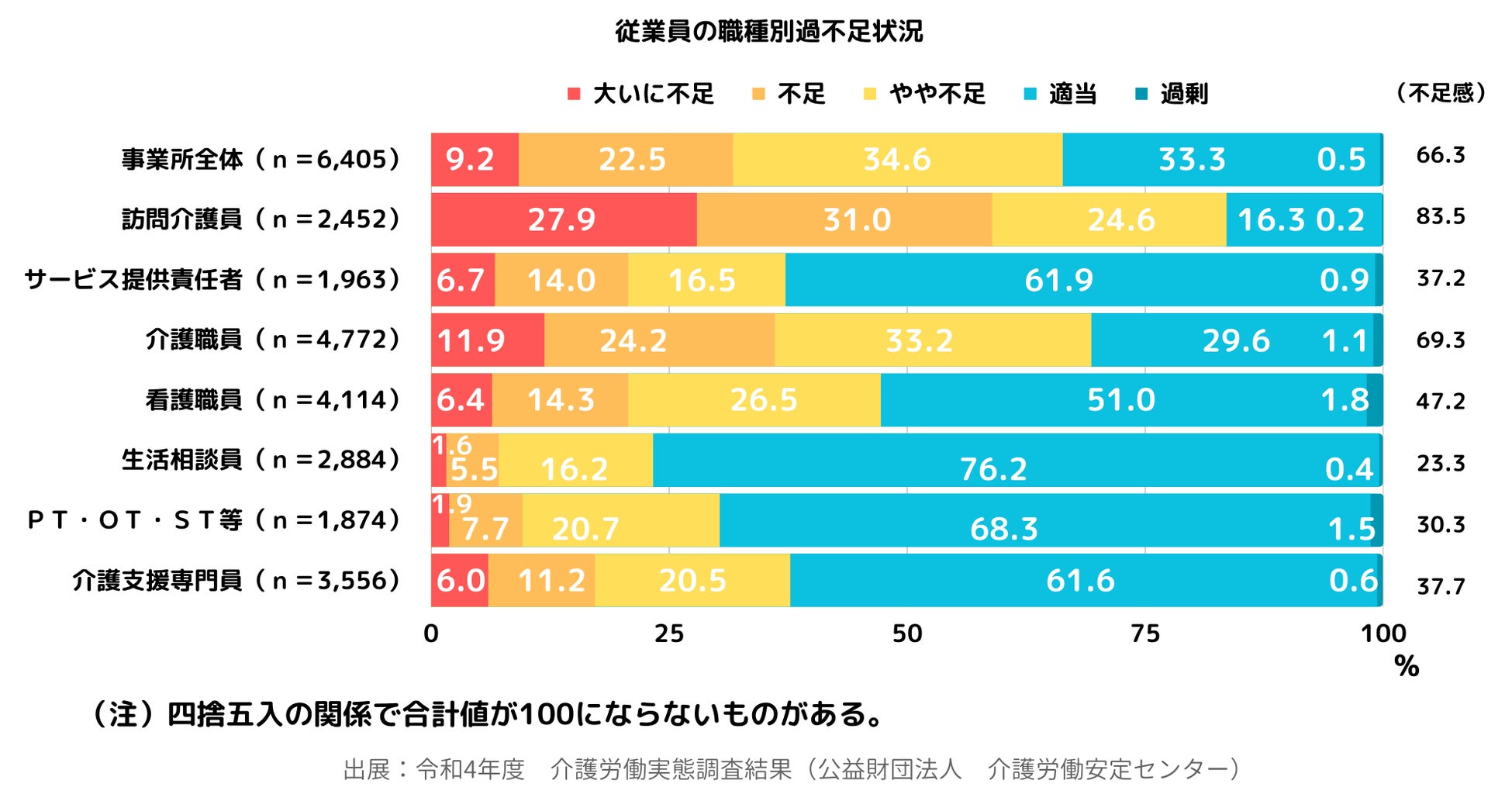 介護事業所における人材の不足感は、毎年高い水準にあり、2023年は66.3%の事業所で不足感がある(「大いに不足」+「不足」+「やや不足」)という結果になっています。